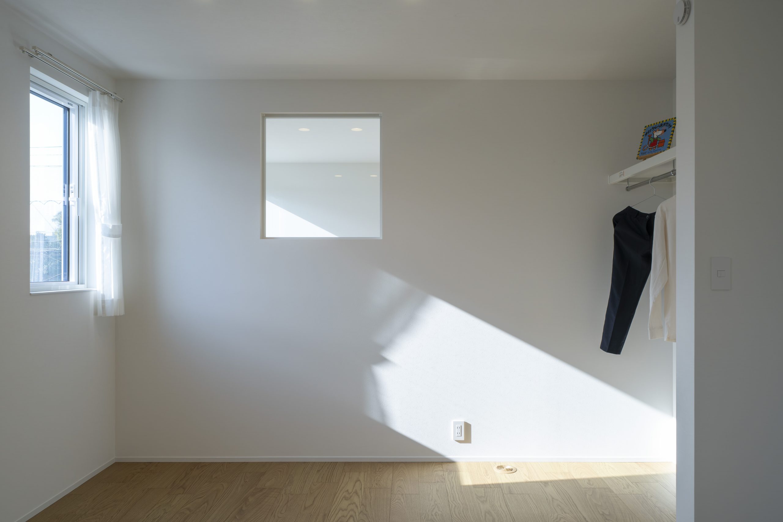 西里: 子供部屋の窓も断熱のために最小限にしていますが、それだけだと閉塞感が出るので、壁に小さな室内窓を設けています。1階と2階が繋がっているような感覚になり、家中どこにいても家族の気配と広がりを感じられるようにしました。