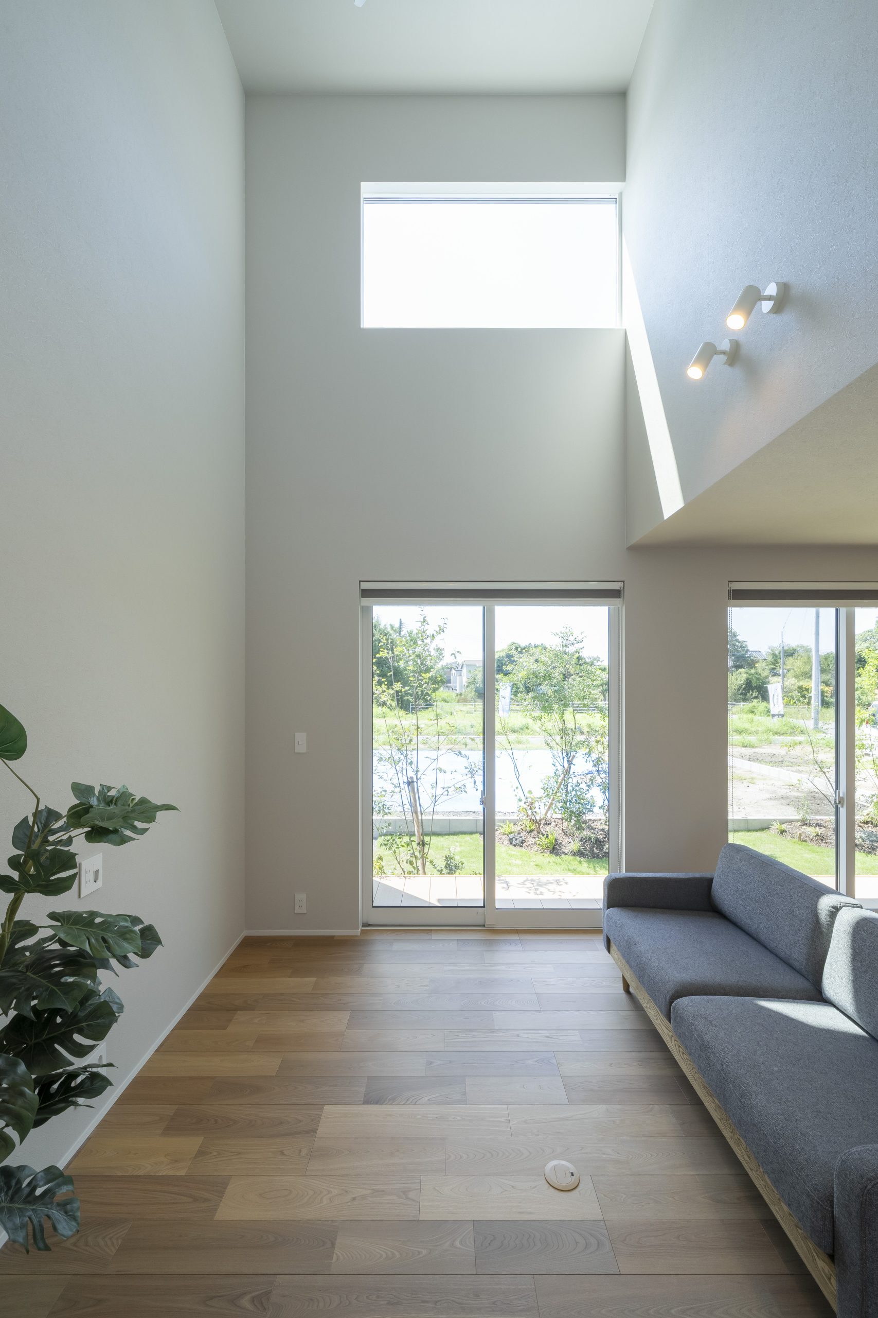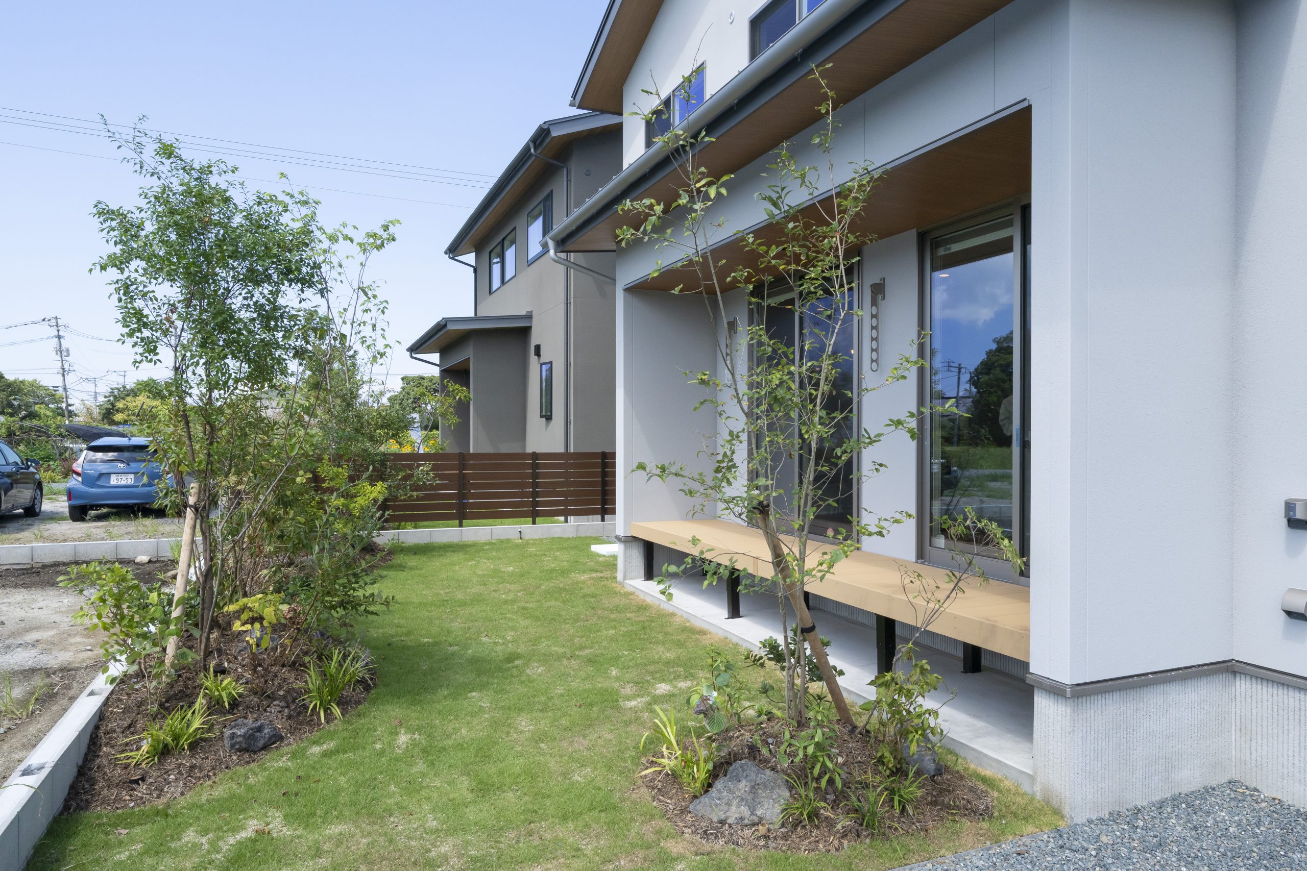 蓑田さん: そうですね。富合ののどかな環境を最大限に活かすため、建物をあえて北側に寄せて配置し、南側のお庭を最大限広く確保しました。ただ広いだけでなく、リビングの掃き出し窓からお庭までが一体に見えるよう、色味の統一感にもこだわっています。