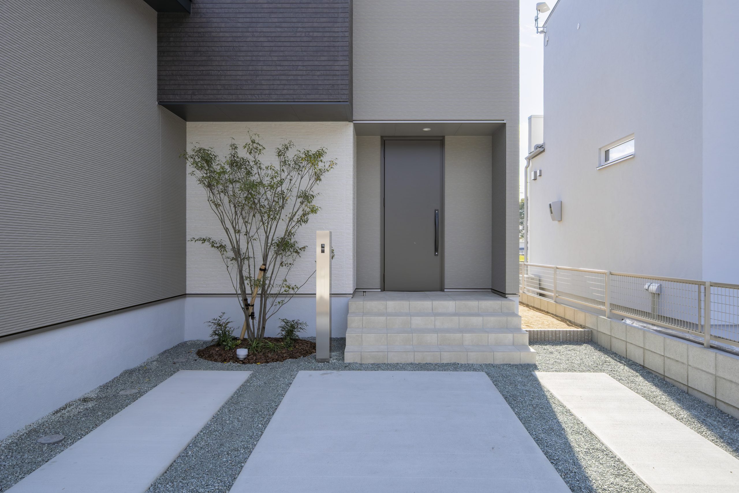 素材を貼り分けた外壁が立体感と深みを演出。洗練されたシックな印象。