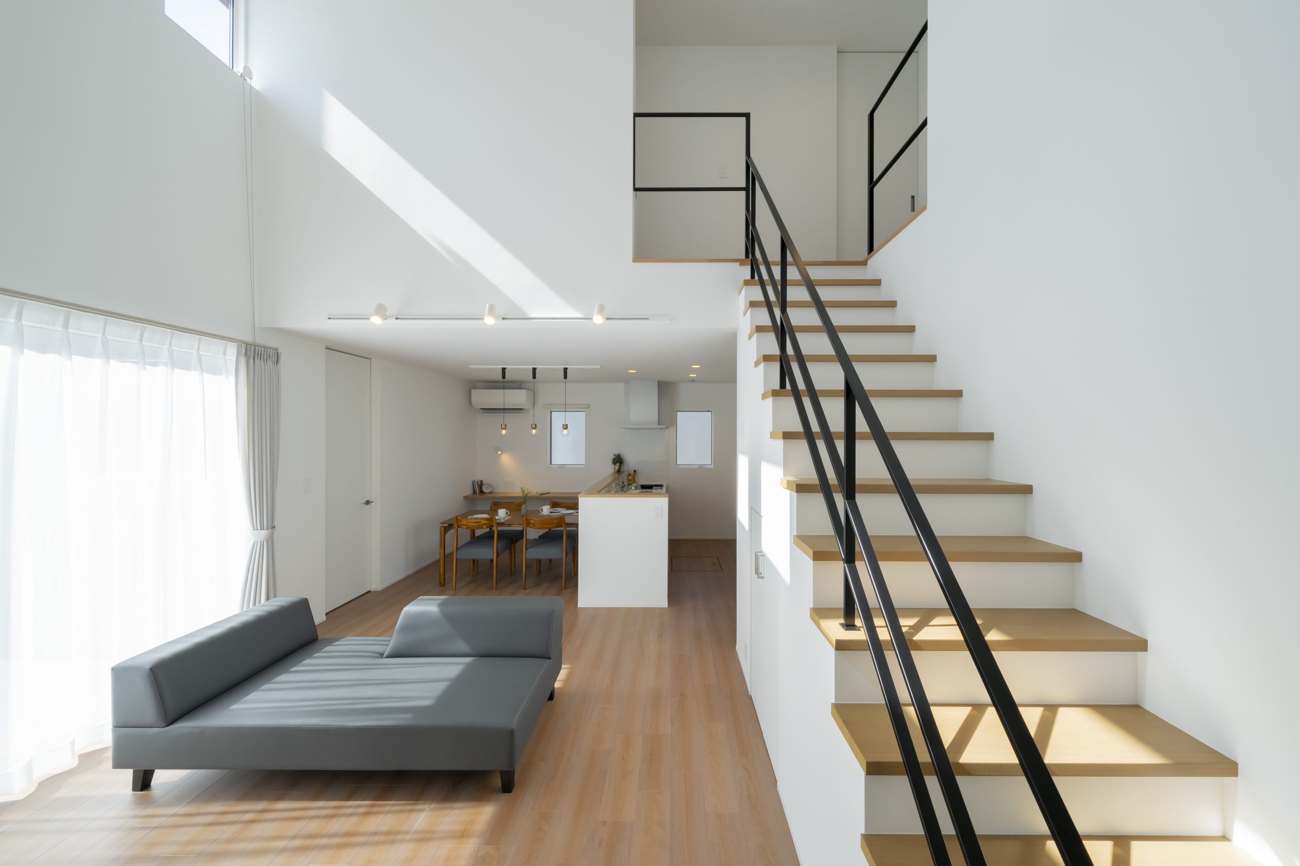 吹き抜けから降り注ぐ自然光が、明るく開放的な空間を創り出す住まい。リビング、ダイニング、キッチンが一体となった吹き抜けLDKは、家族みんなが自然と集まり、笑顔が溢れる場所。大きな窓から繋がるタイルデッキは、内と外を緩やかにつなぎ、開放感をさらに高めます。晴れた日には、バーベキューやお子様とプール遊びをしたり。家族のライフスタイルに合わせて、様々な使い方ができる、多目的スペースです。2階には大容量のウォークインクローゼットを完備。家族みんなの衣類や荷物をまとめて収納でき、お部屋をすっきり保てます。