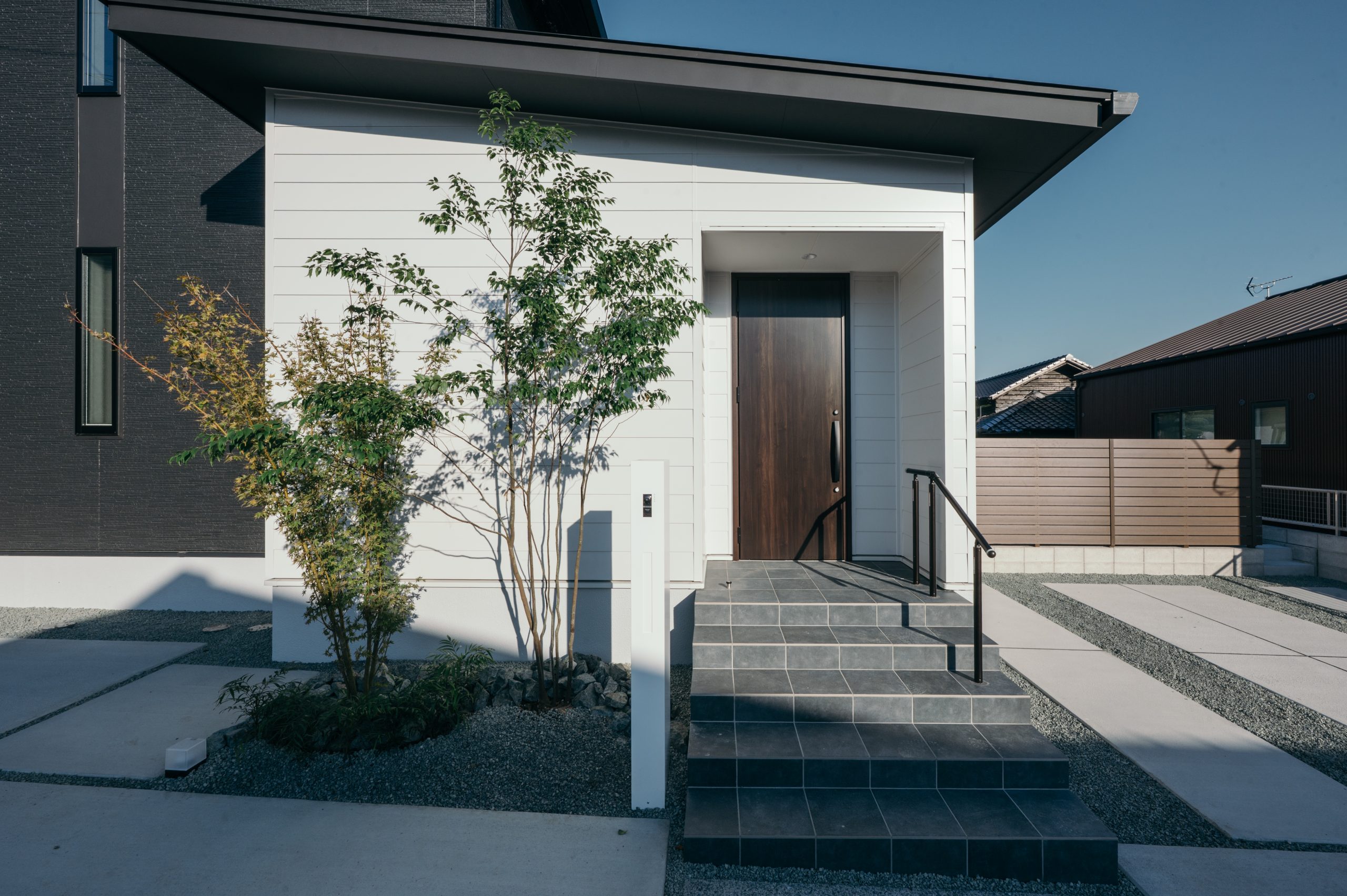 黒ベースの外壁と白のガルバリウムのコントラストが際立つ、クールでスタイリッシュな外観。