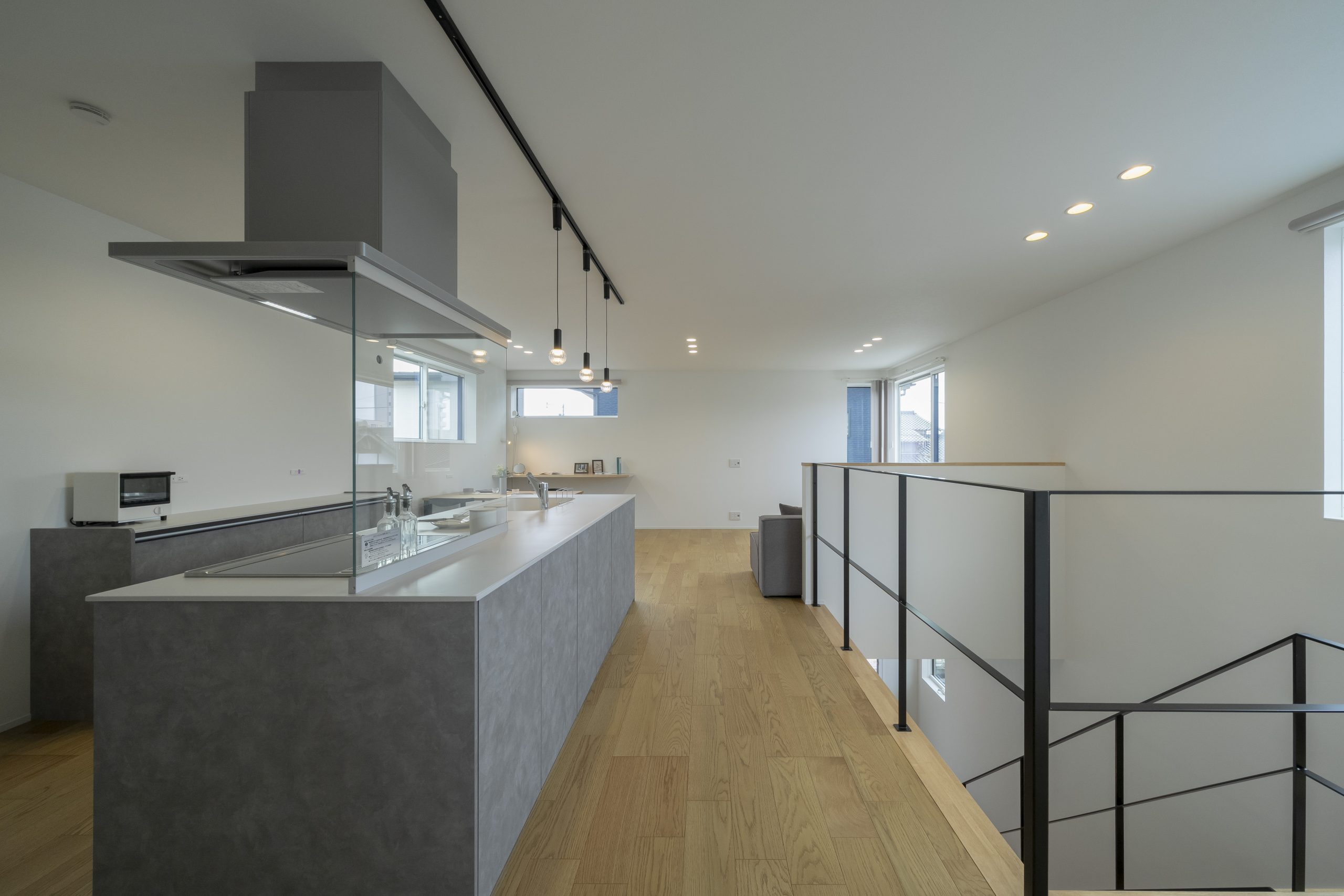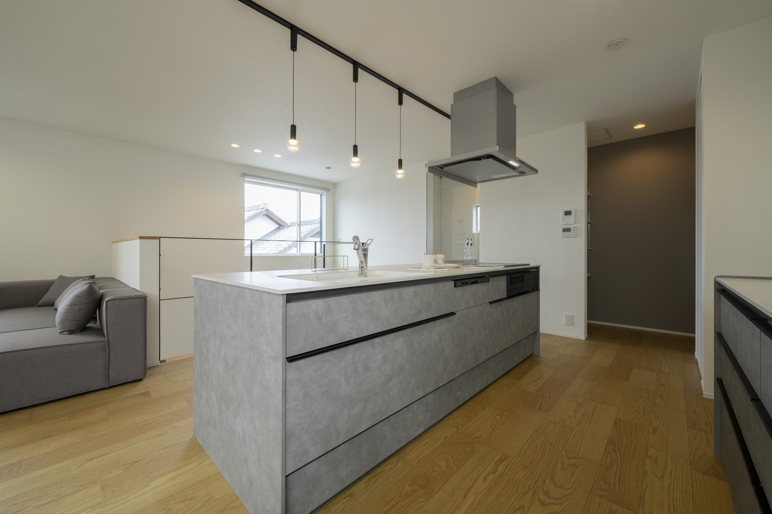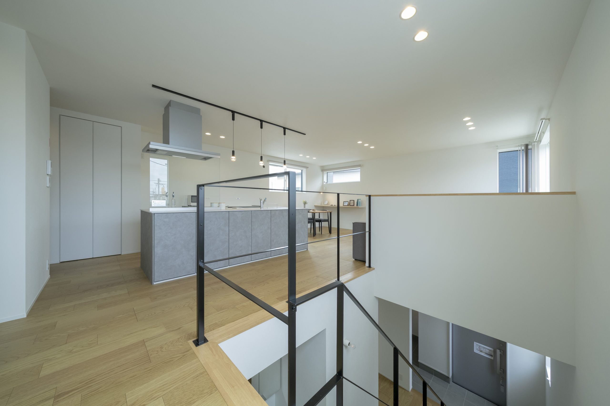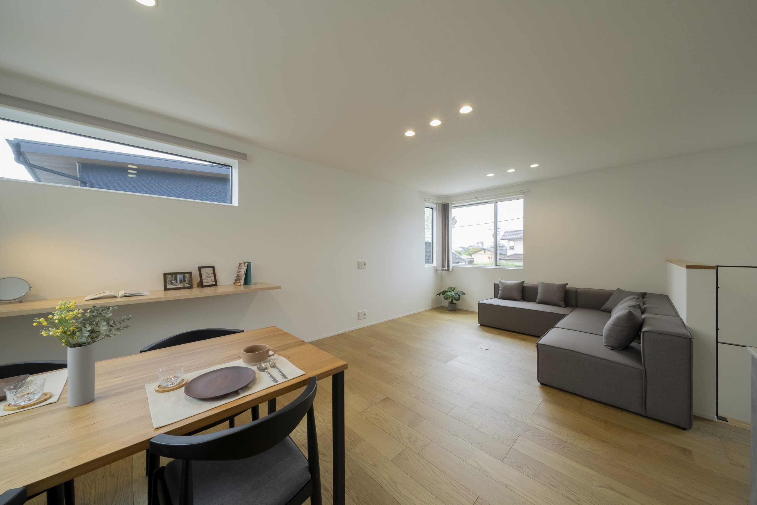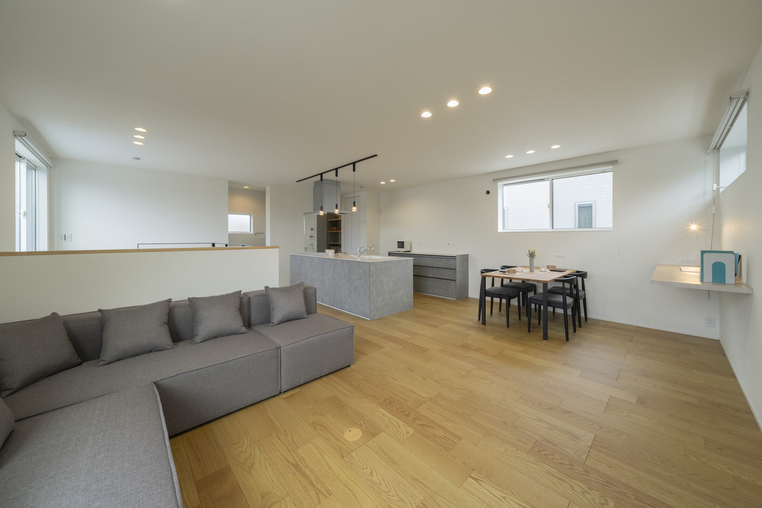周囲の視線を気にせず、プライベートな空間を大切にした二階リビングの住まい。一階に居室と水廻りを設け、使いやすい家事動線と、無柱の大空間で叶える開放感を両立。敷地の特性を活かし、縦列駐車含め計4台駐車可能なスマートな駐車計画も魅力です。大きな窓から光が満ちるリビングは、内と外が一体となり、心身ともにリラックスできる安らぎの空間。デザイン性と機能性を兼ね備えた、二階リビングの新しい暮らしを提案します。