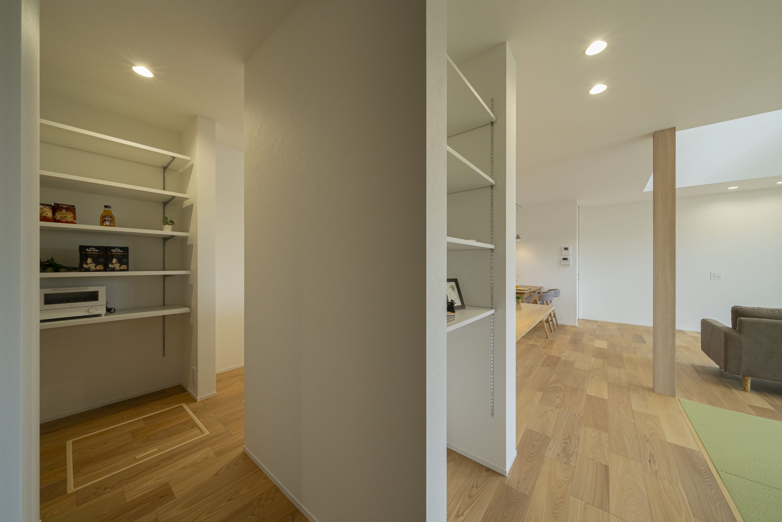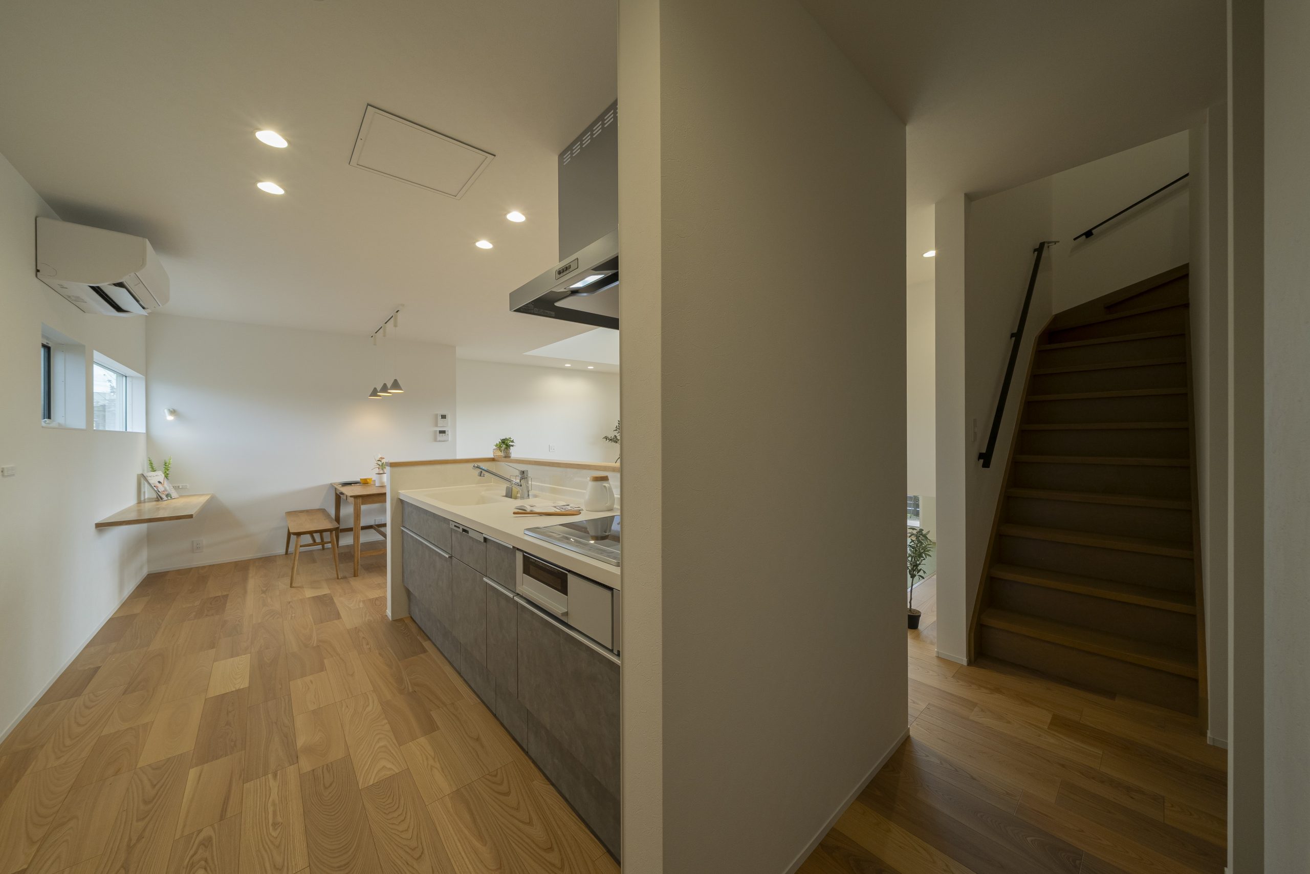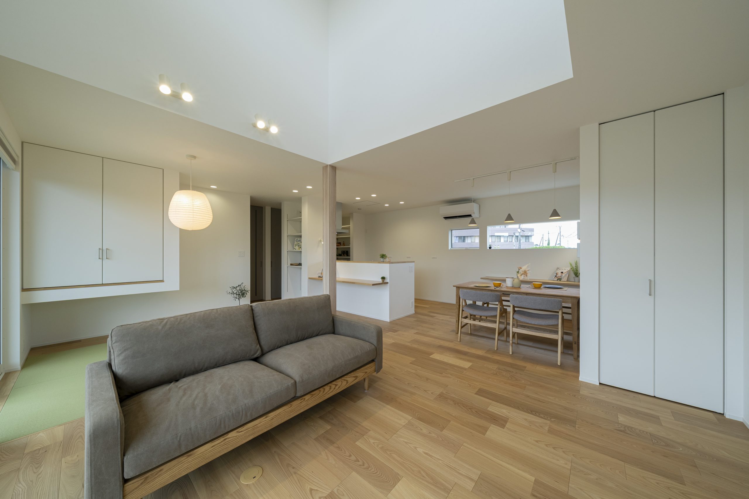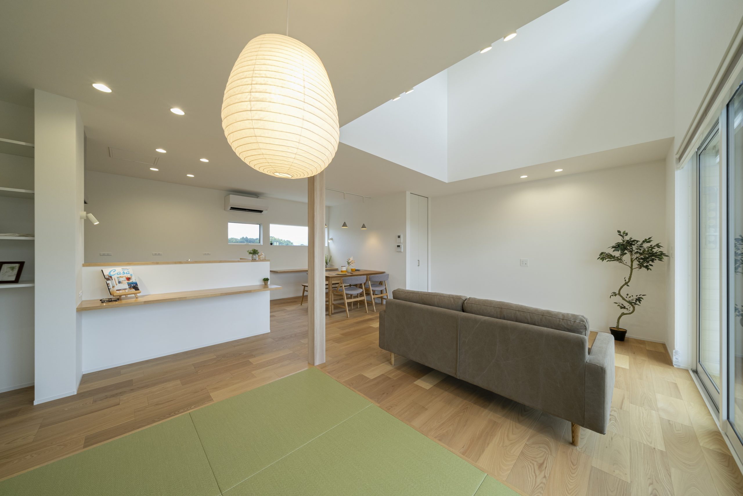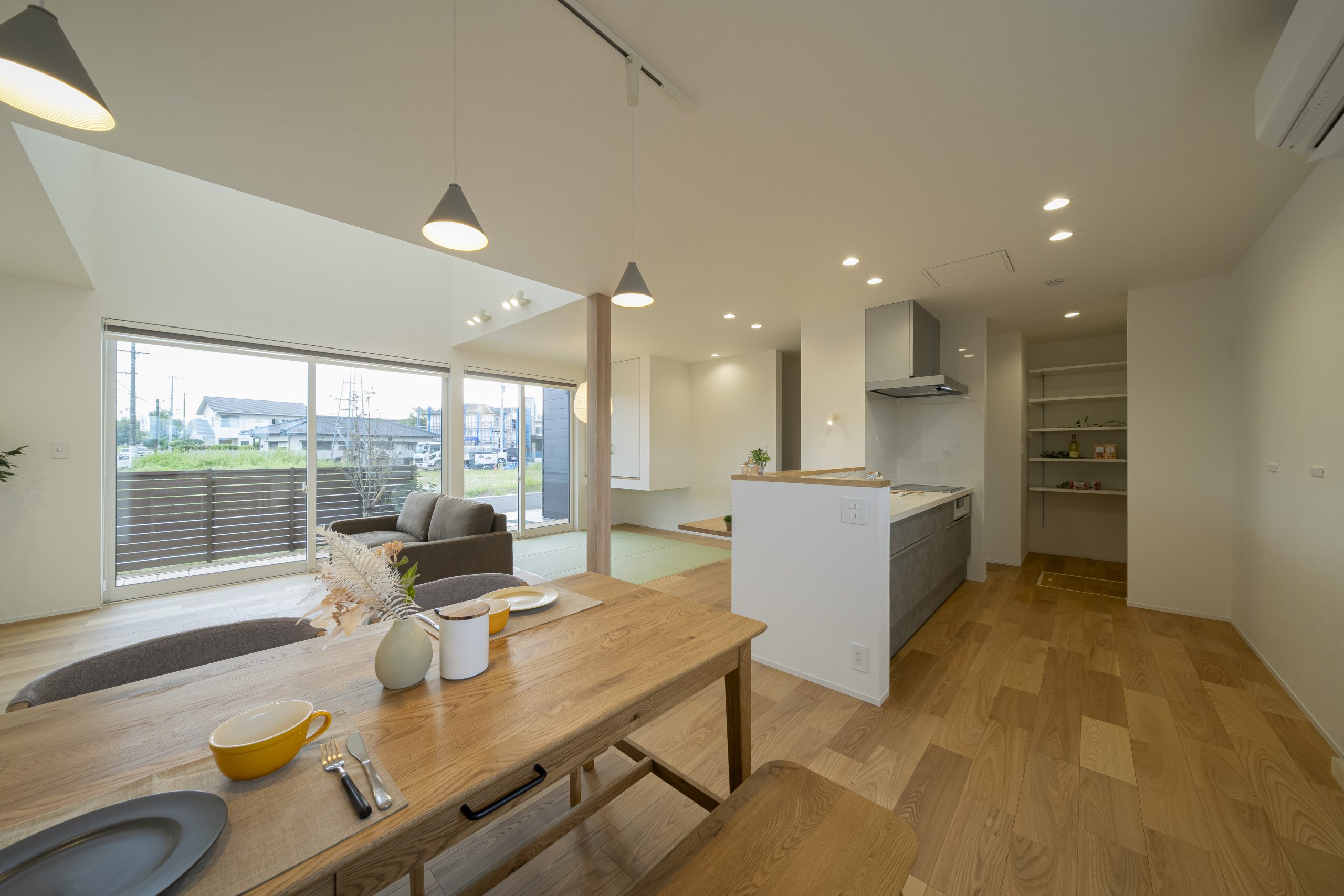 異なる素材と色合いを使い分け、木目がアクセントとなったデザインが、周囲の植栽と一体となり、豊かな表情を創り出します。玄関からリビング、水廻り、キッチンへとスムーズにアクセスできる回遊動線は、日々の家事をストレスなくこなし、ゆとりの時間を生み出します。南に面した大きな窓から光が差し込むリビングは、家族が自然と集まり、会話が弾む心地よい空間。外観の美しさ、植栽との一体感、そして内部の快適な動線と明るいリビング。デザインと機能性が両立し、自然と暮らしが調和する、理想の住まいです。