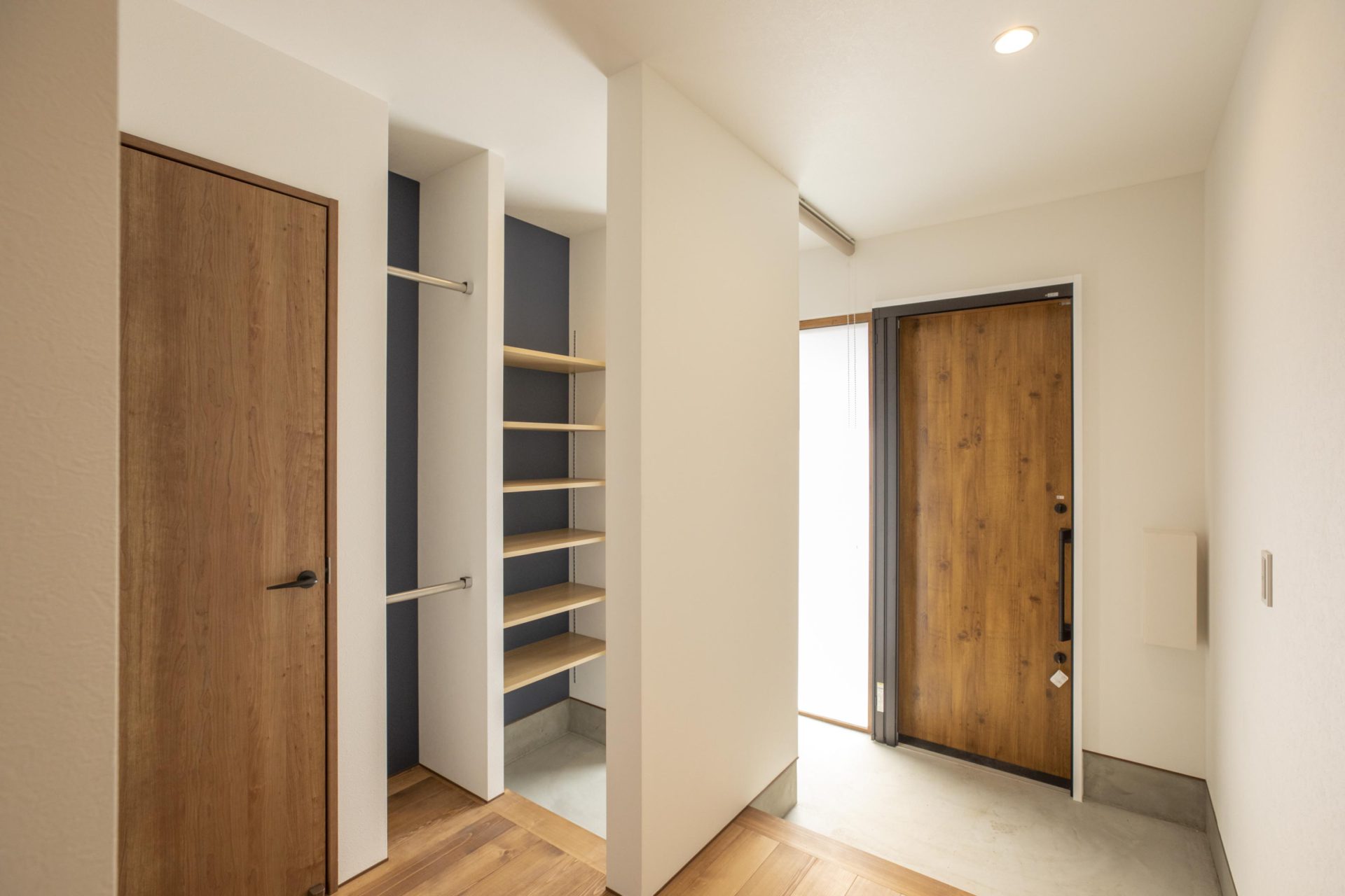 玄関からパントリーへ繋がる家事楽動線、大人シックな住まい