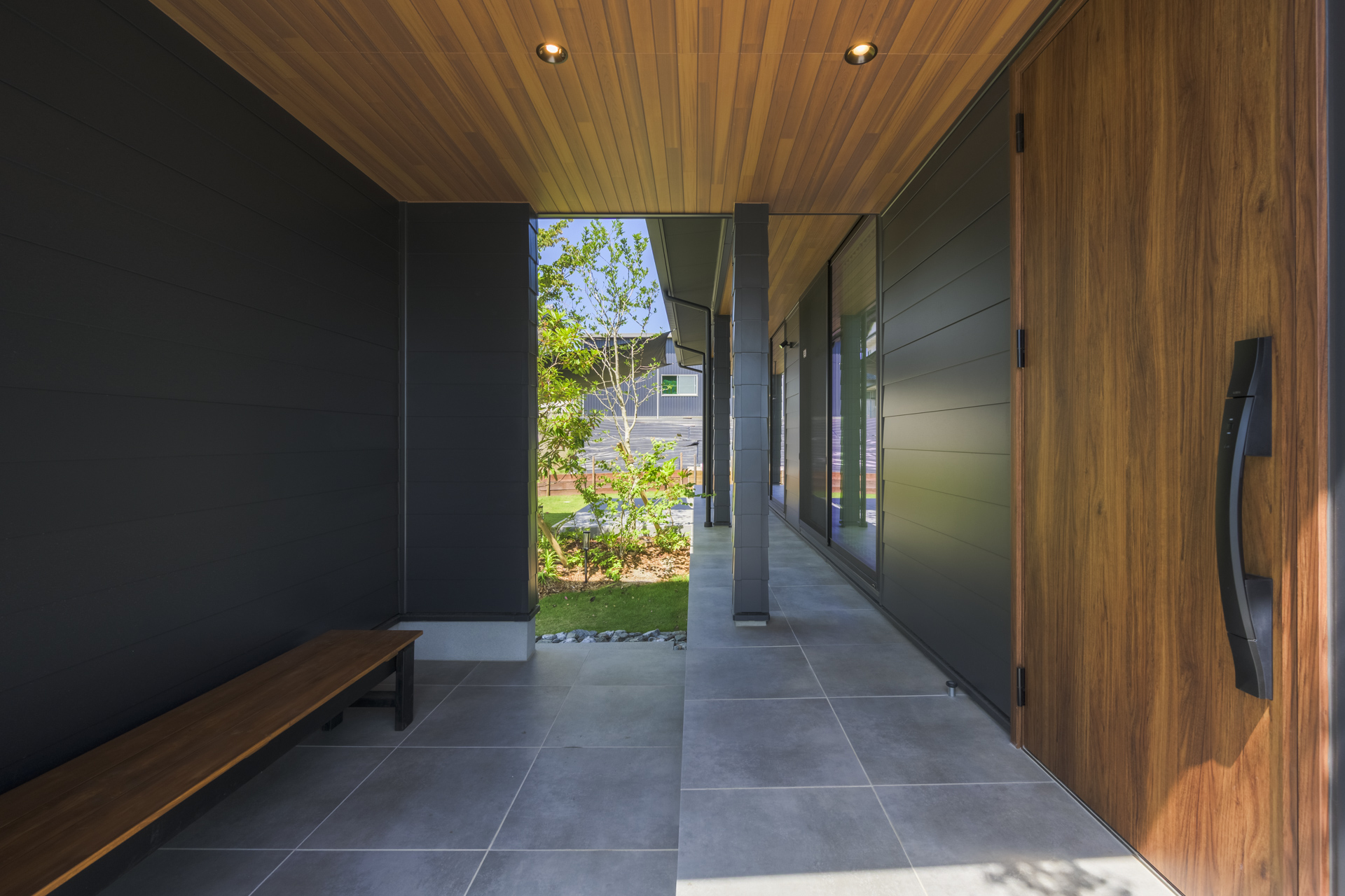 軒の深いタイルデッキにつながる広めの玄関ポーチ。