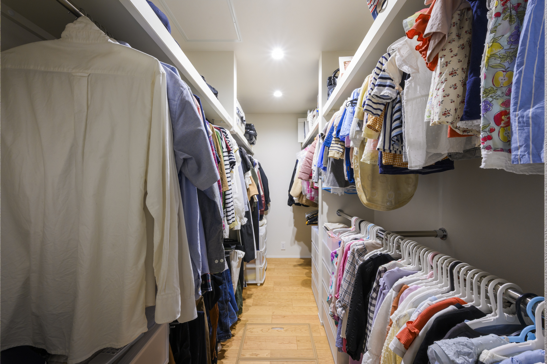 約4帖のウォークインクローゼット。家族全員分のお洋服が余裕で収納可能。