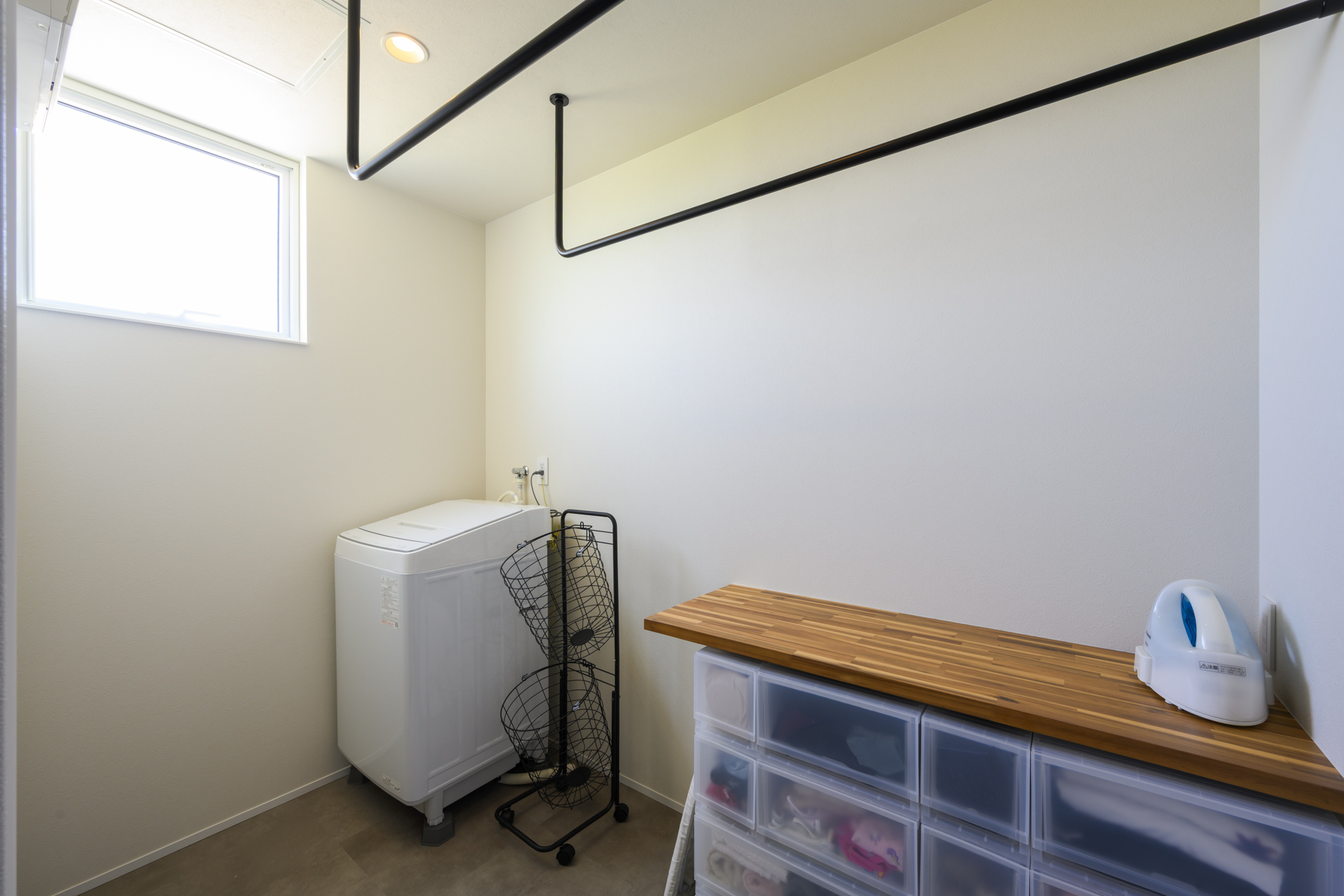 アイロンがけもできるカウンターを設置したランドリースペース。