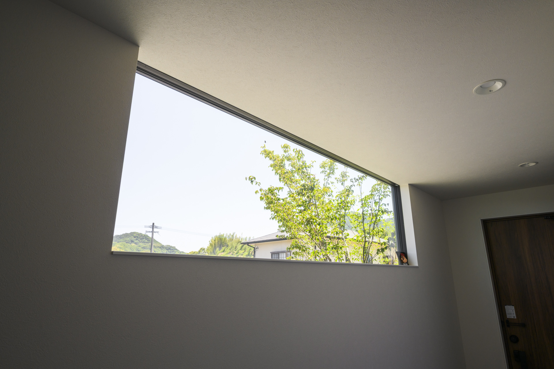 玄関の上部に設置した窓は、青空と植栽を切り取るピクチャーウィンドウに。