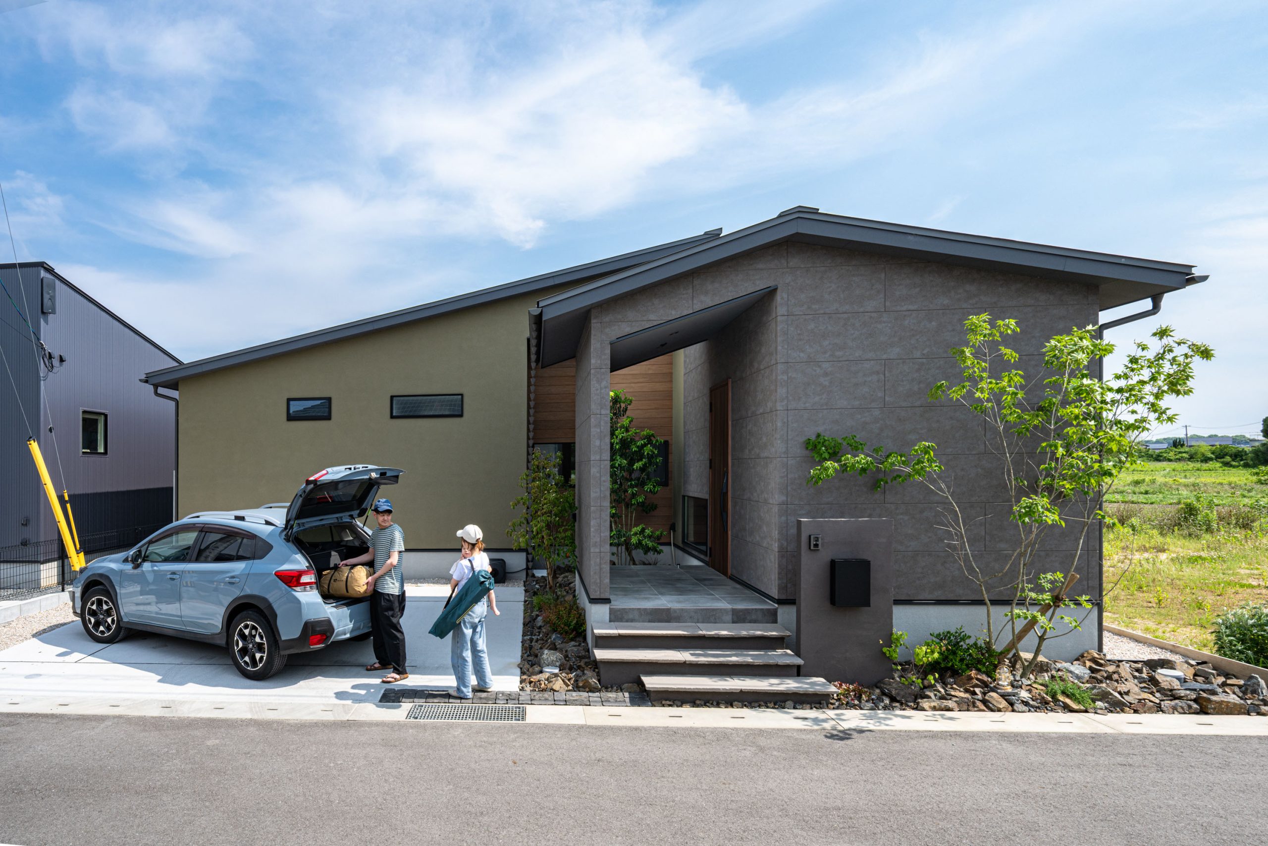 モスグリーンの塗壁と窯業系サイディングを組み合わせた外観。