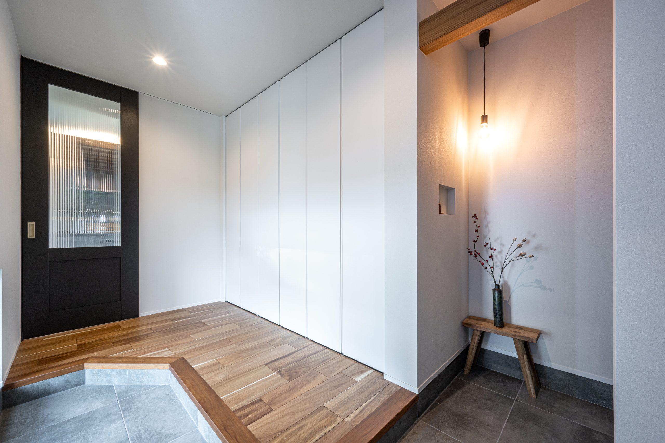 L字型の広々とした玄関スペース。