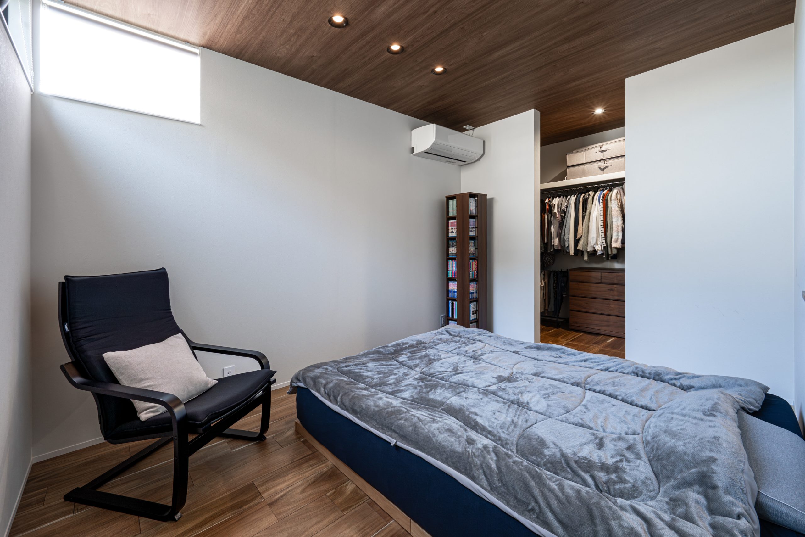 主寝室は、天井に木目調のクロスを貼って落ちつく空間に。