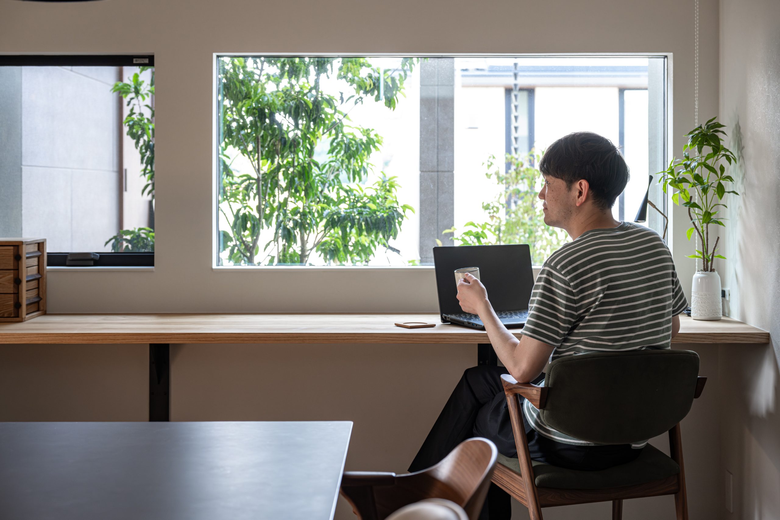 坪庭を眺めながら仕事や勉強ができるダイニング横のスタディカウンター。