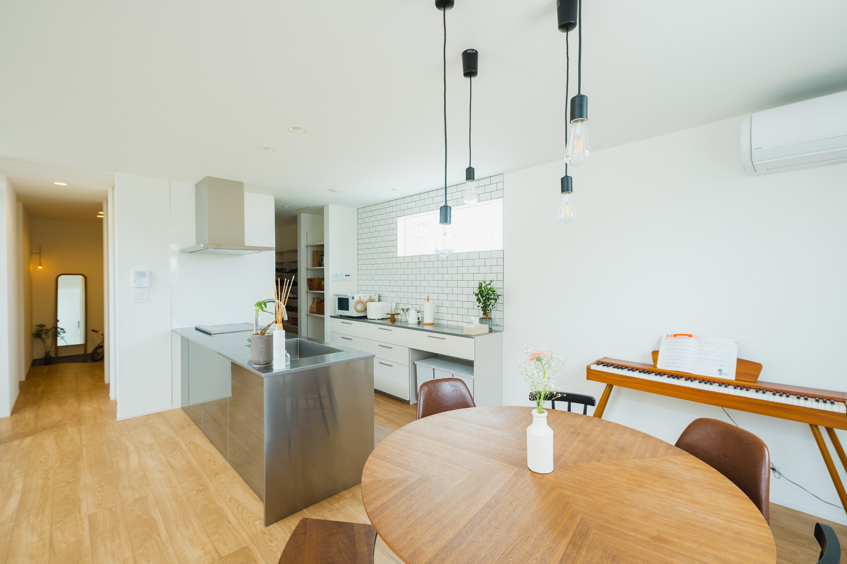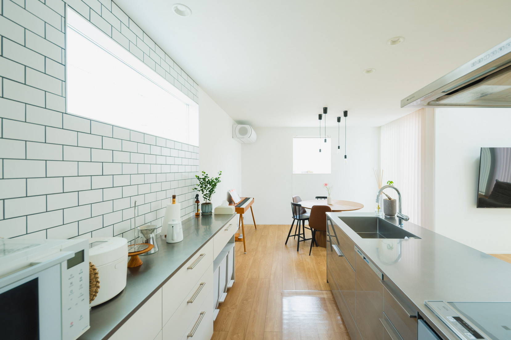 キッチンからはシンボルツリーの「アオダモ」が見え、家の中にいながら四季を感じられる工夫を。爽やかな光が射し込む清らかな家。