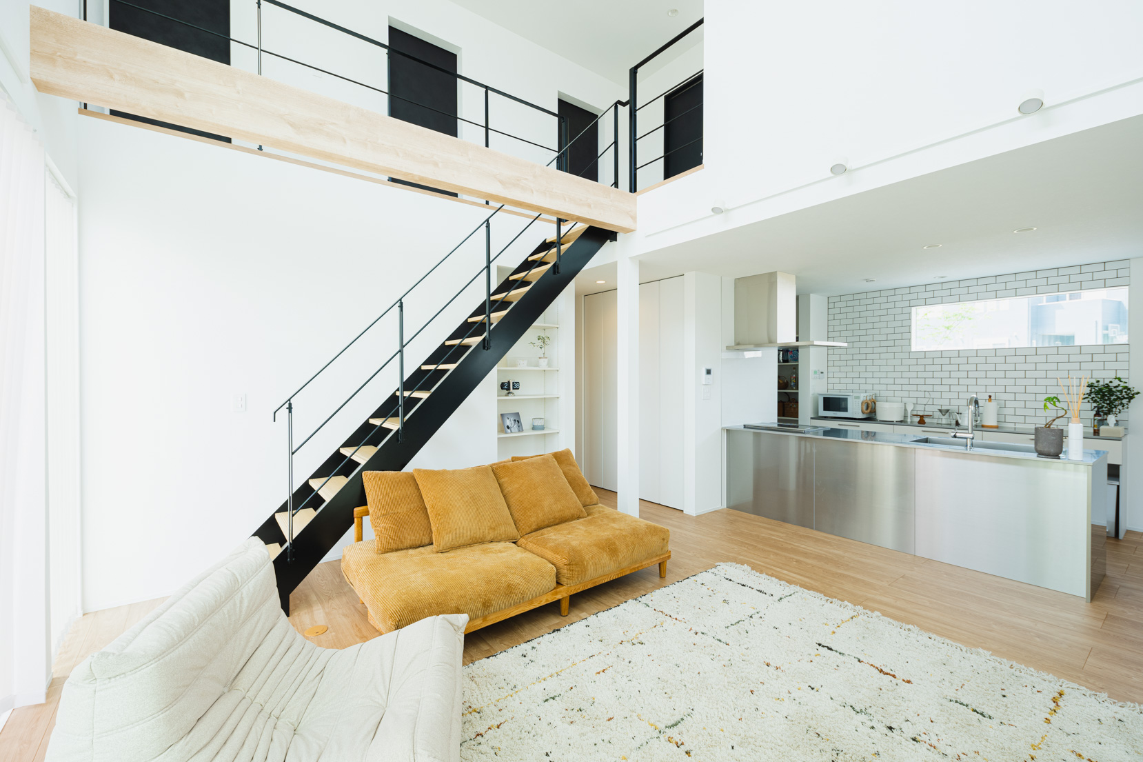 吹き抜けから2Fの居室ドアが見えるデザイン。