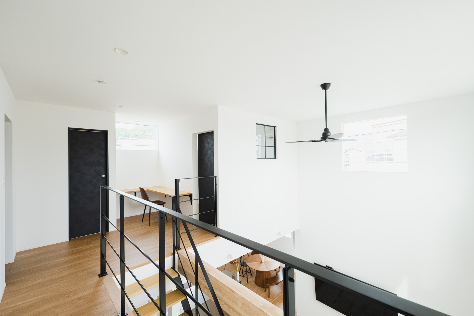 2F廊下から見る吹き抜けの空間。主寝室の室内窓がアクセントに。