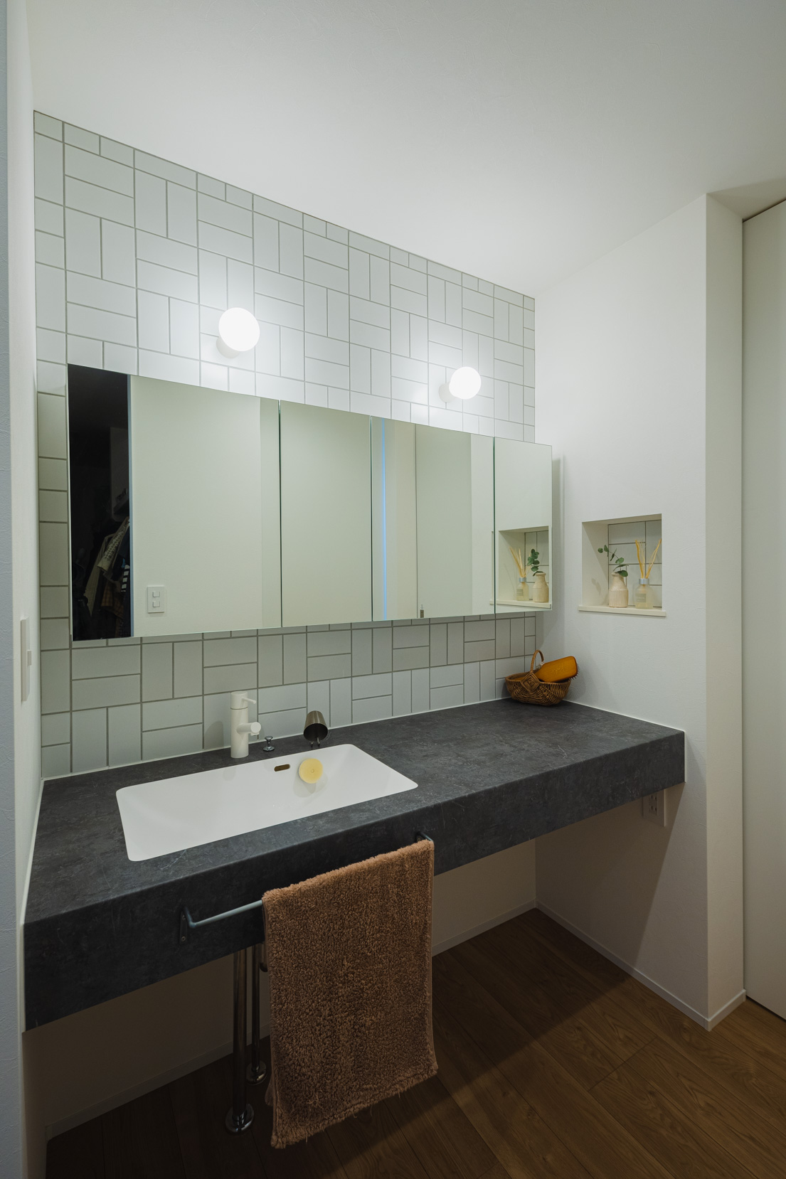 大人2人並んでも広々使える洗面台。タイルの貼り方を工夫することでより洗練された雰囲気に。