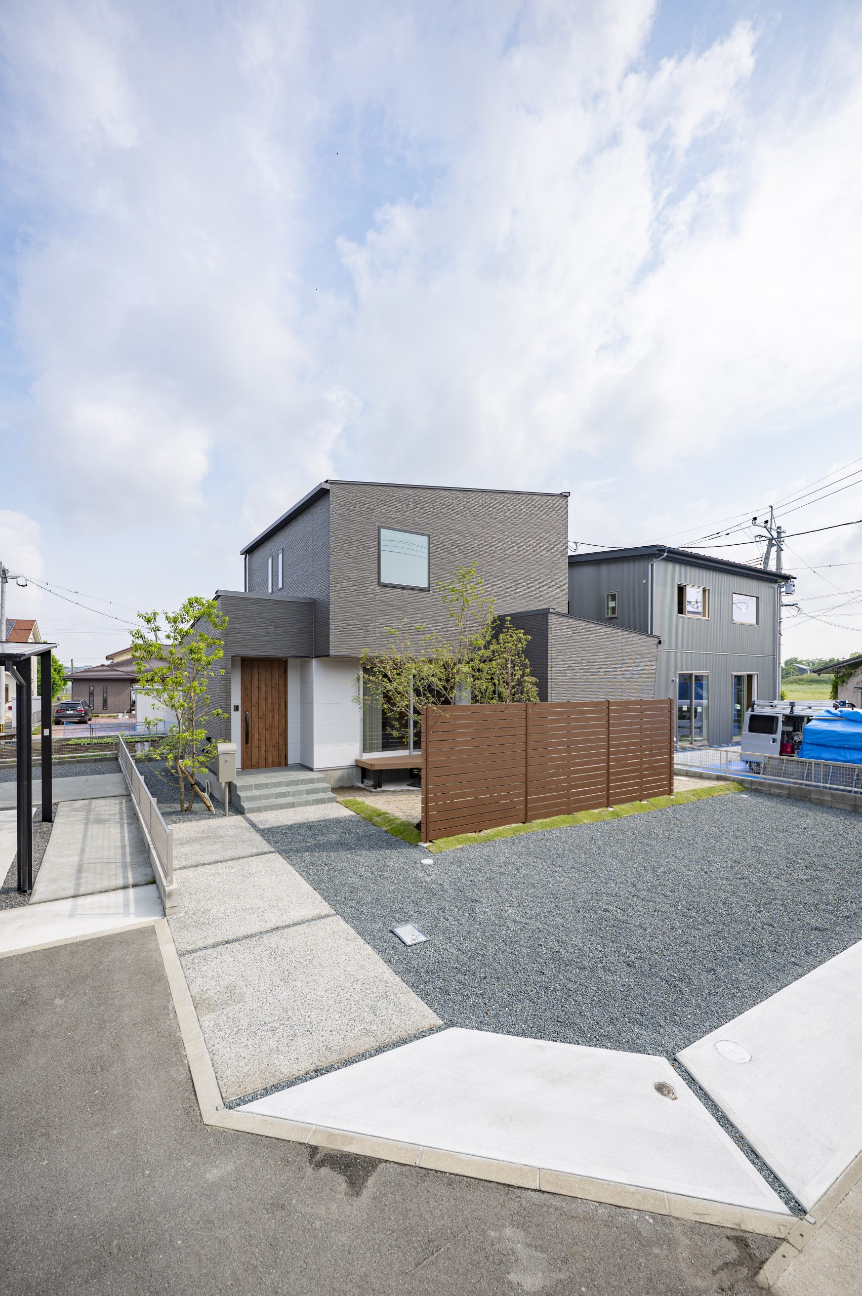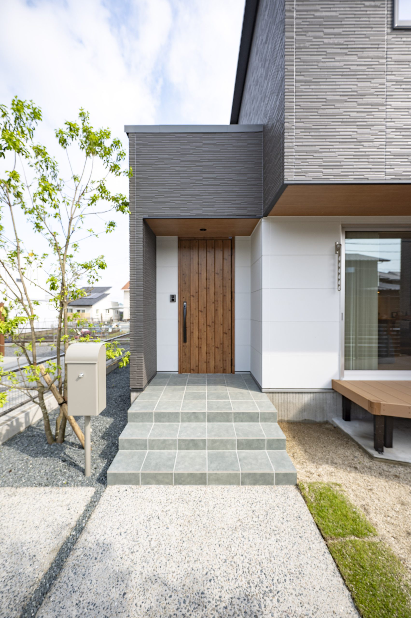 計算されたアプローチの質感とシンボルツリーの緑が、モダンな外観に柔らかな表情を添えている。
