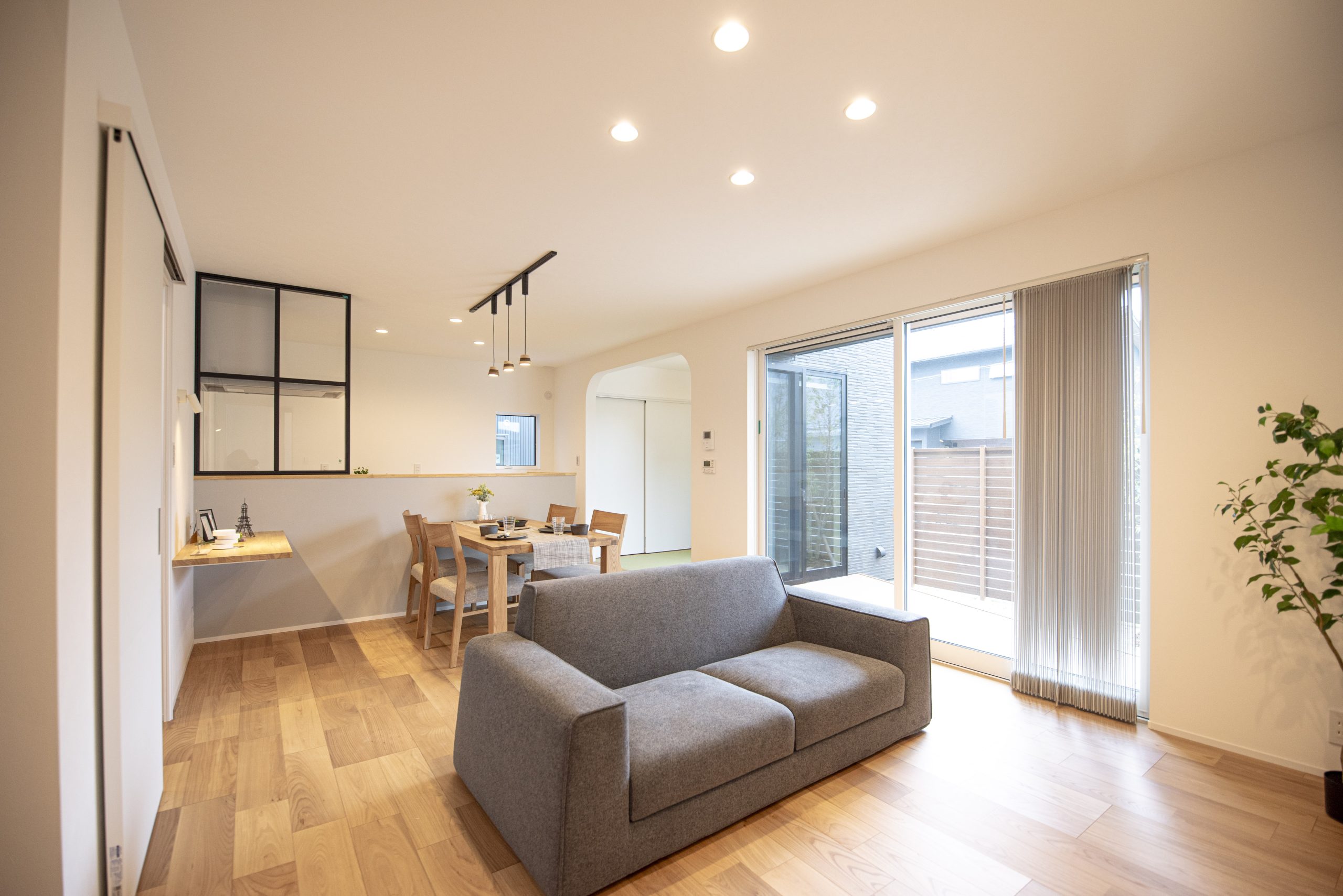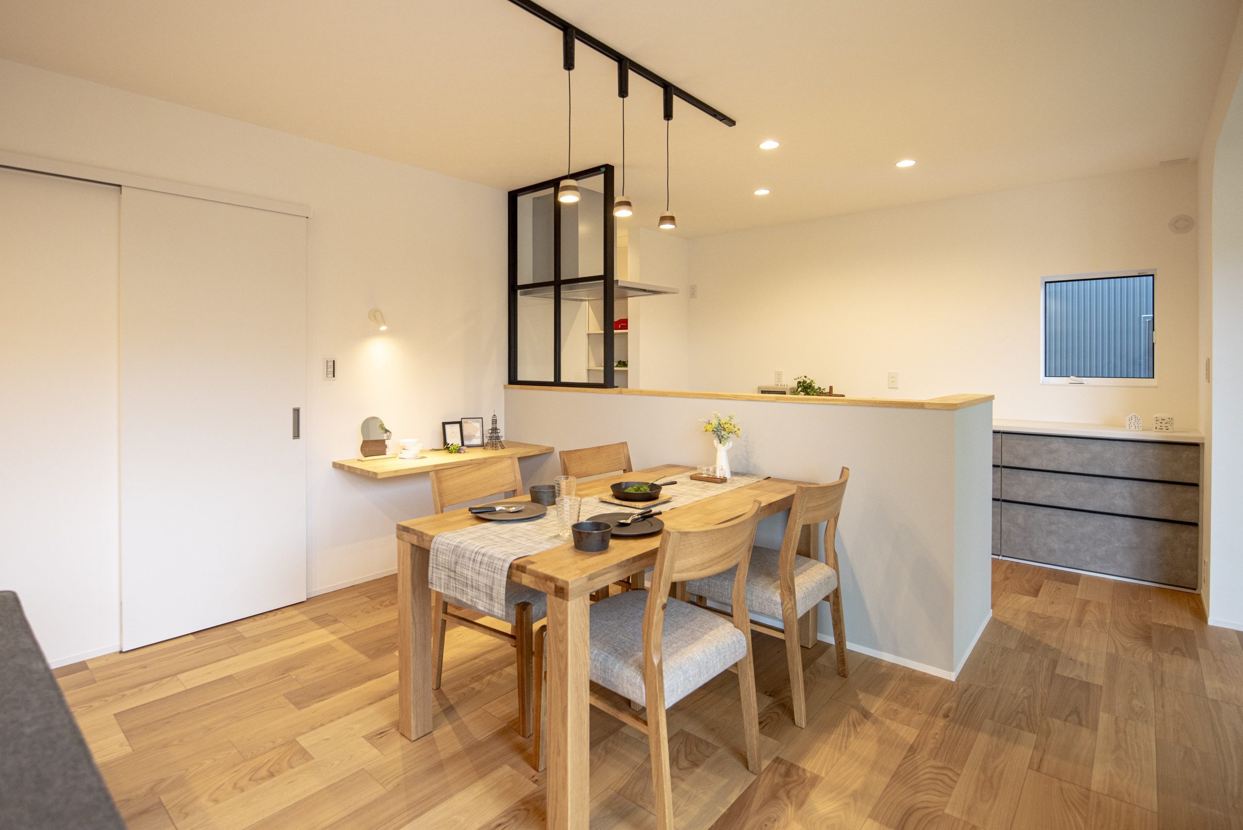 キッチンのスタイリッシュな室内窓は、空間を緩やかに仕切りながらも、家族の気配を常に感じさせてくれる。