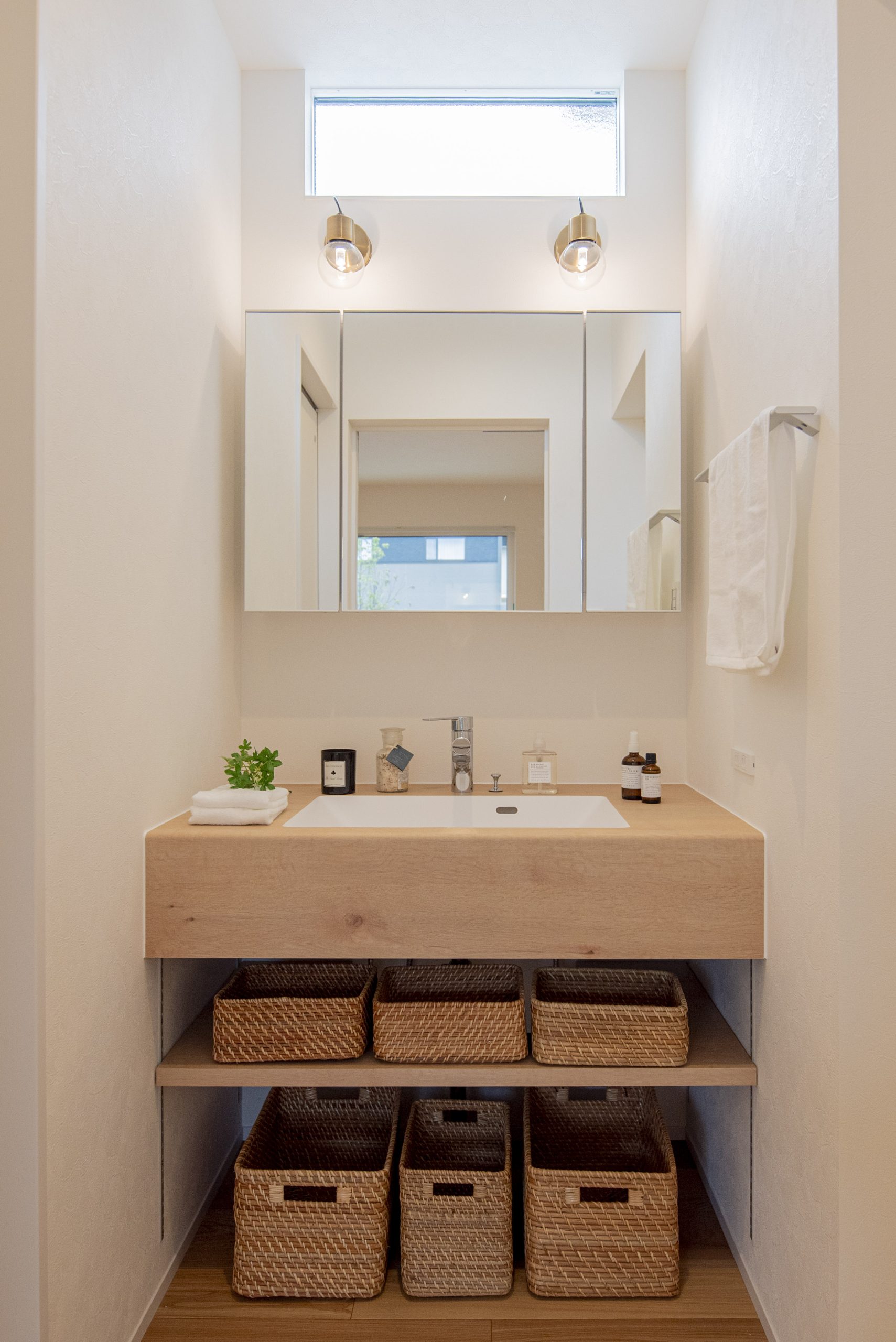 木調の造作洗面を採用することで統一感のあるデザインに。