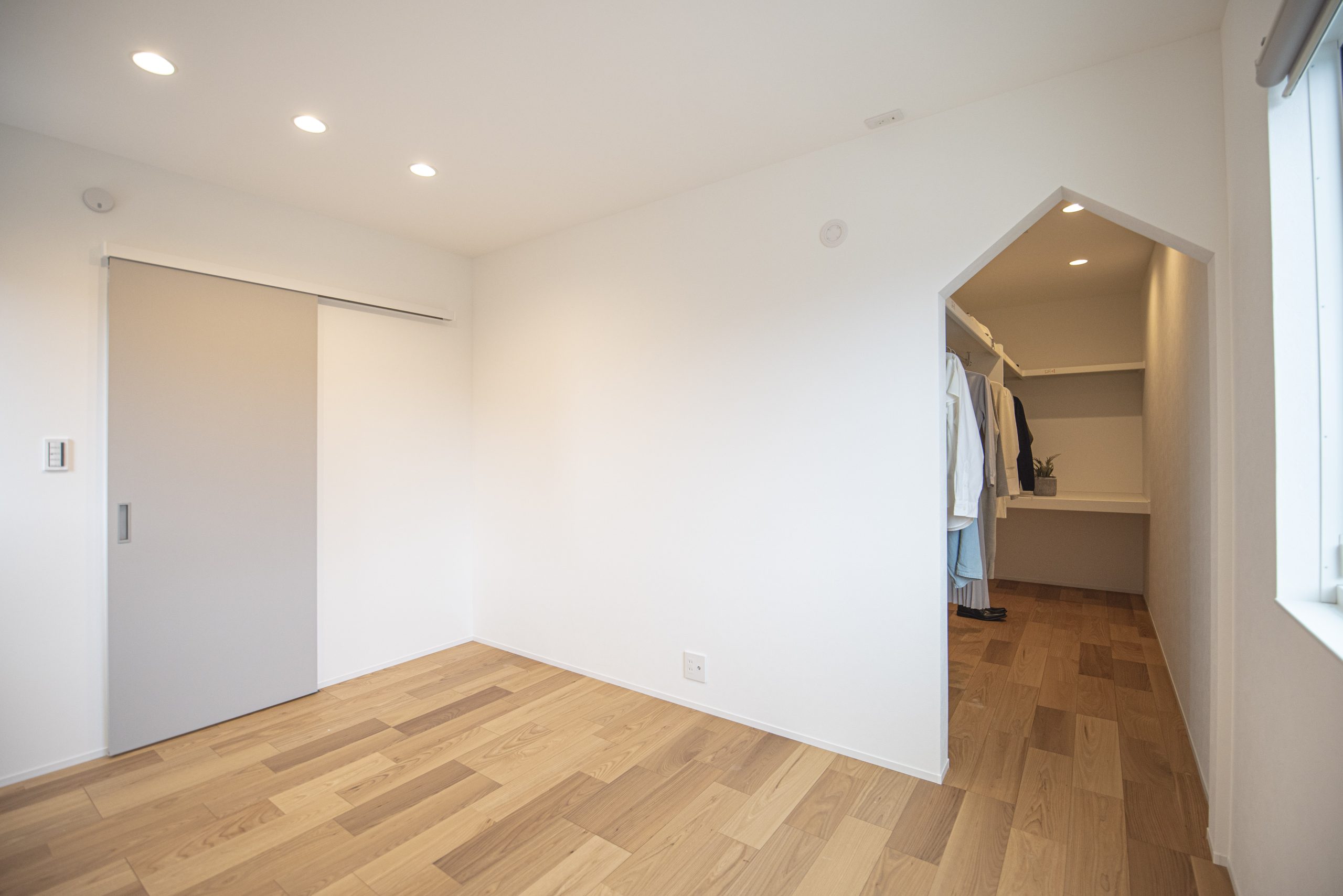 広くとった主寝室には、扉を付けずに空間を分ける垂れ壁の大容量WIC。