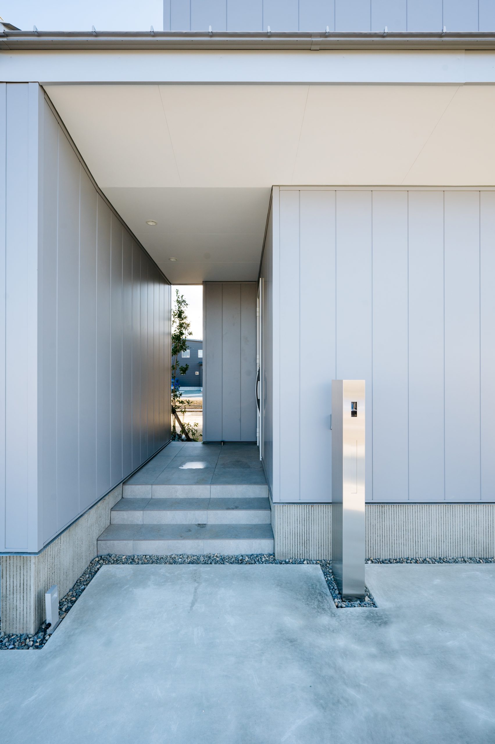 玄関へと続く静かなアプローチは、切り取られた光と緑が、帰宅する家族を優しく迎え入れてくれる。