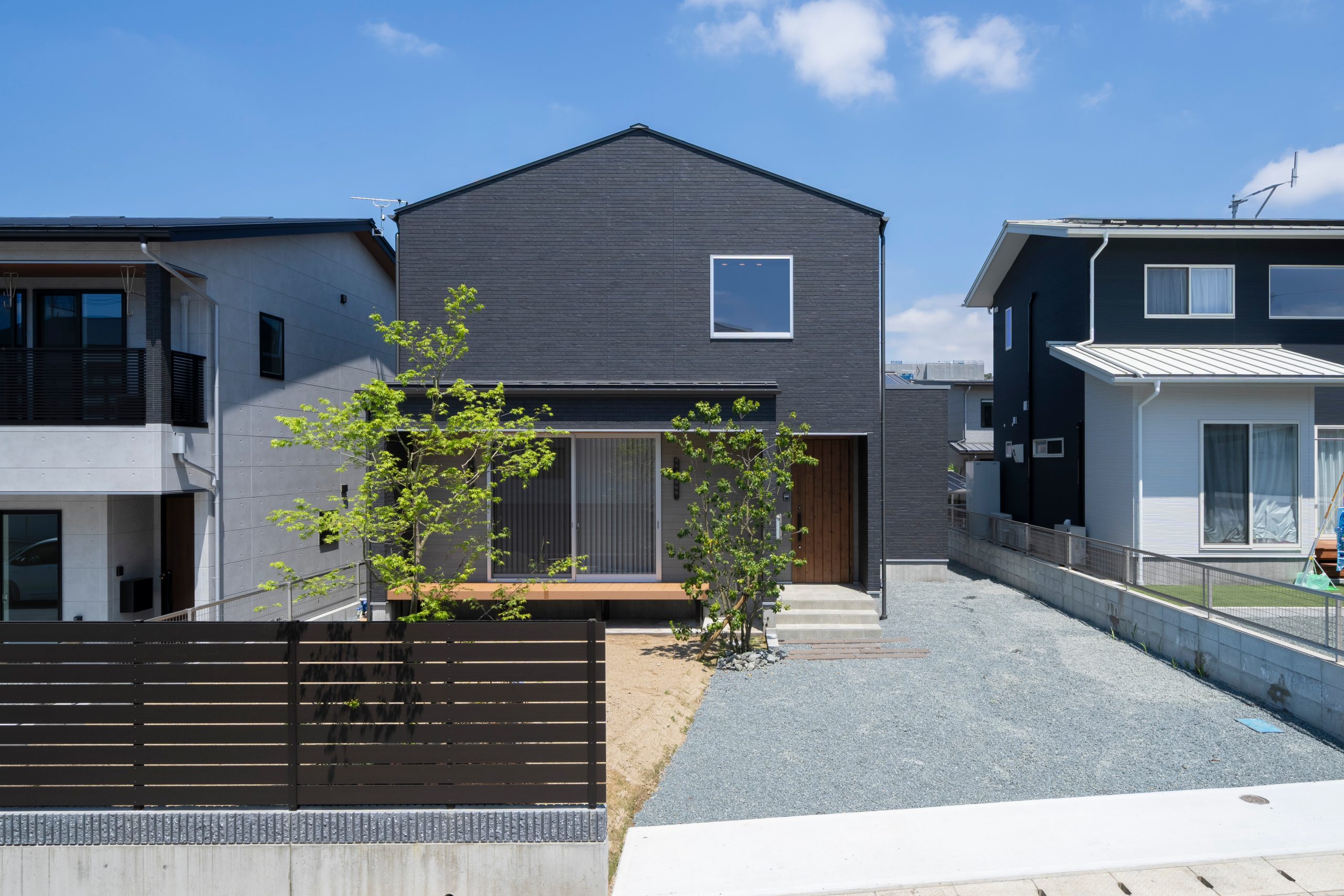 黒の外壁に木目調のドアが映える、シンプルながらも重厚感のある佇まい。スクエアな窓がアクセントとなり、道ゆく人の目を引くモダンな邸宅。