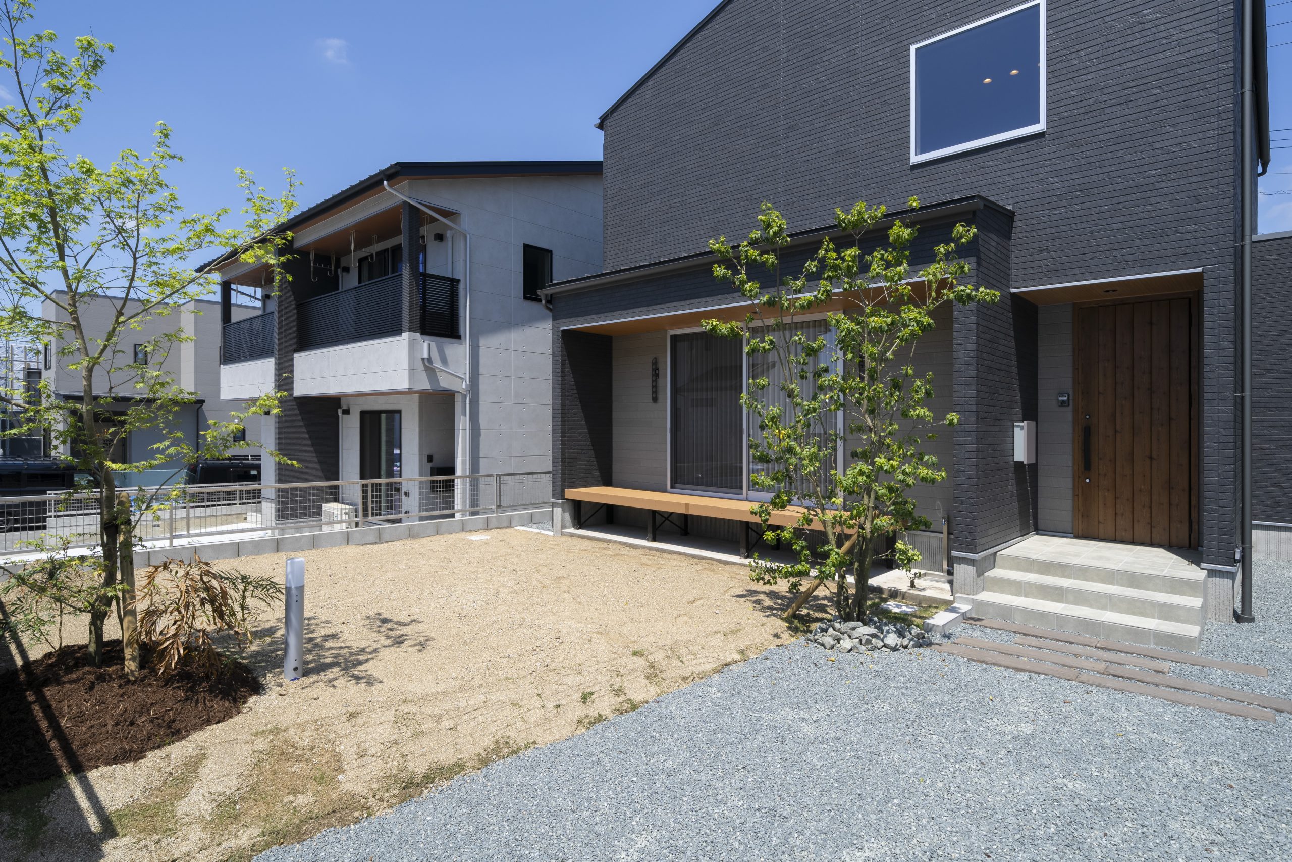 シックな外観に温かみを添えるウッドベンチは、庭の木々を眺めながら季節の移ろいを感じ、家族や近隣とのゆるやかな繋がりを育む特等席になる。