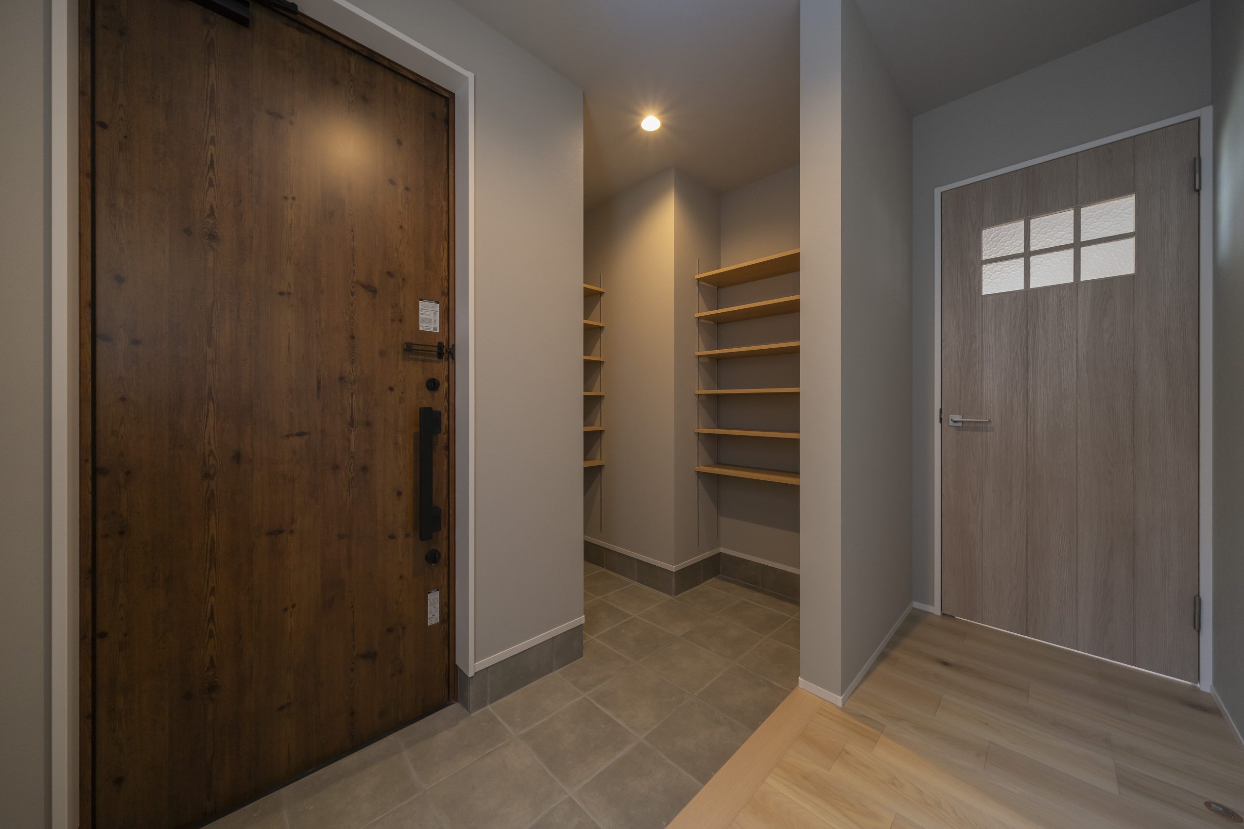 重厚感のある木目調の玄関ドアと、奥行きを感じさせる土間収納。機能美とデザインが融合した、家族を優雅に迎え入れるエントランス。