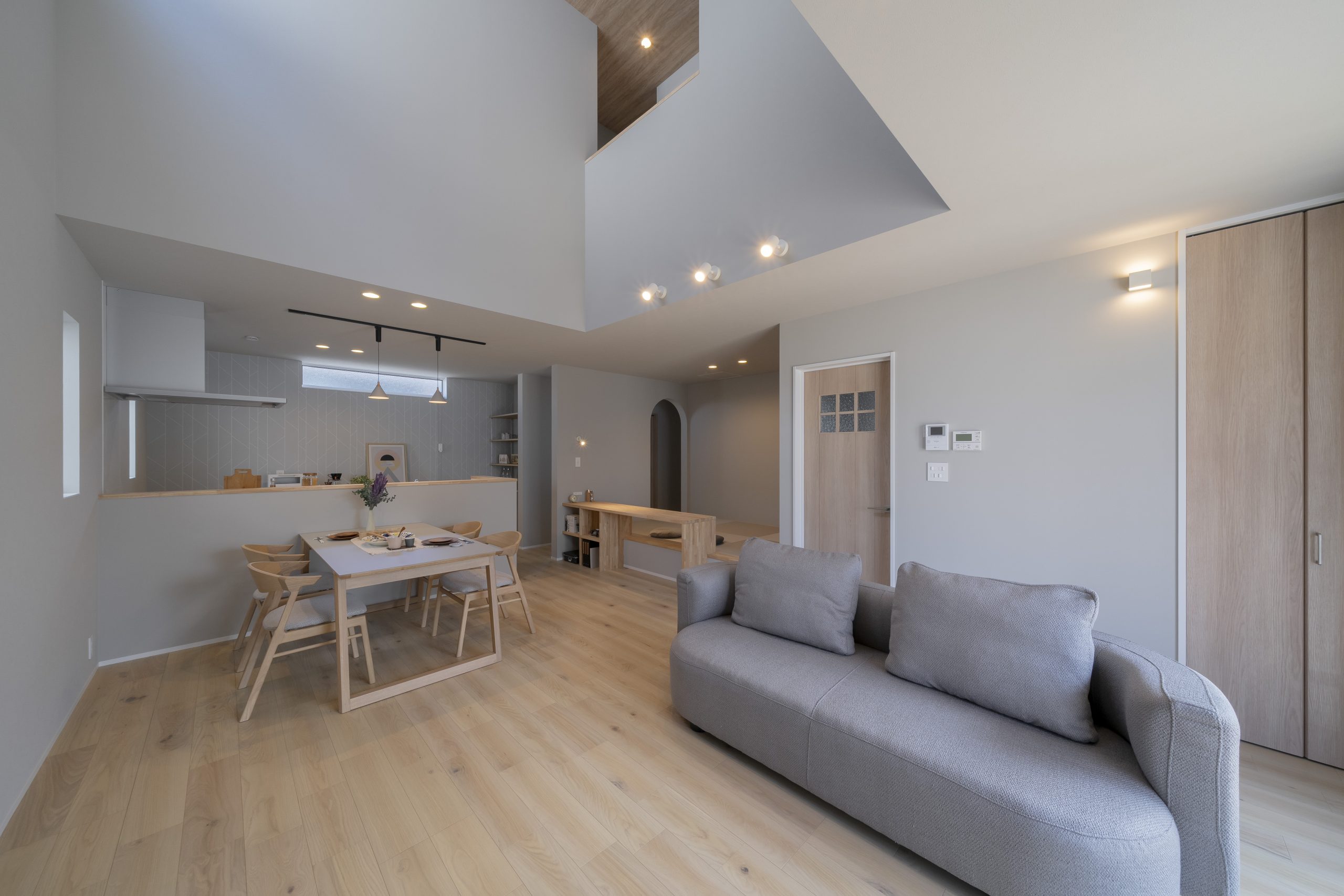 一歩足を踏み入れると広がる、ダイナミックな吹き抜け空間。高い位置から注ぐ自然光がグレーを基調としたインテリアを優しく包み込み、家族が集う場所を明るく開放的に彩ります。
