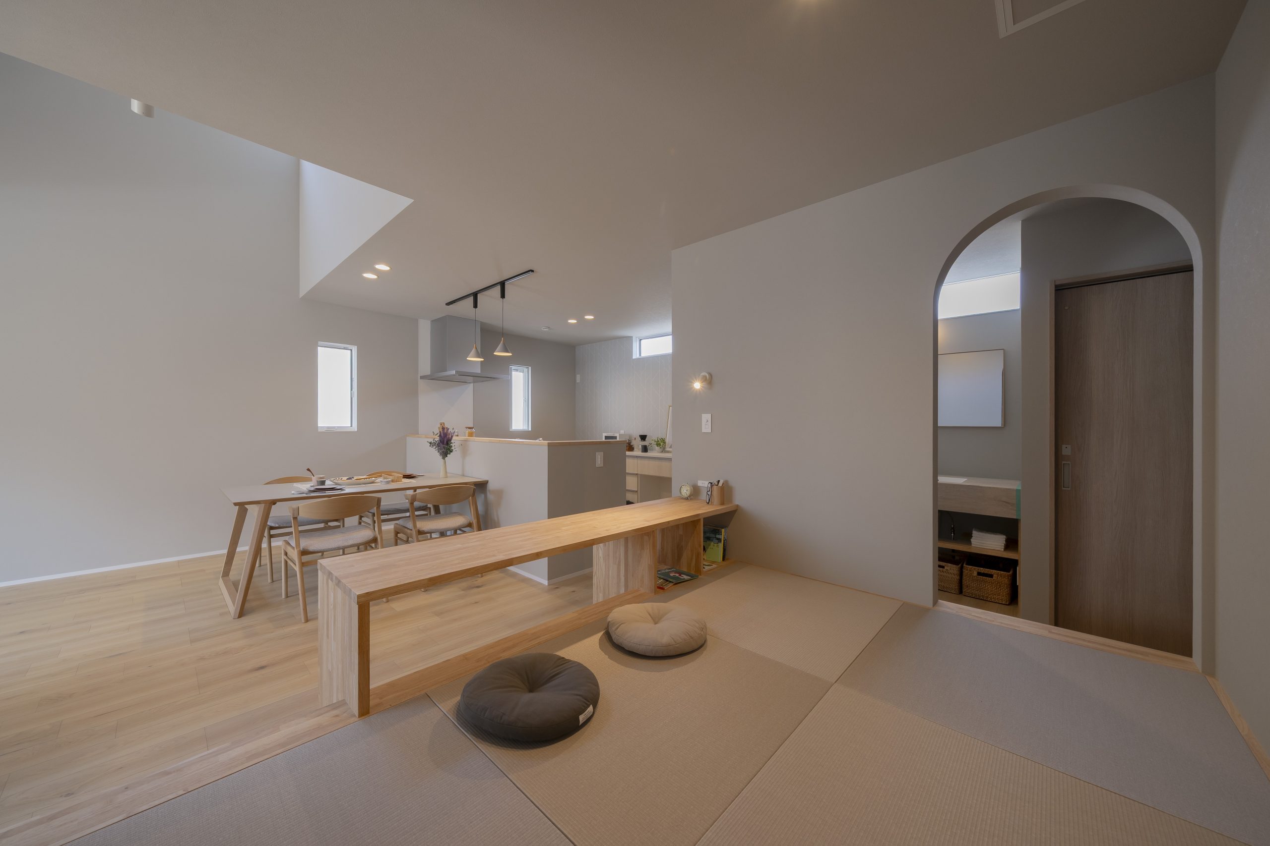 リビングの一角に設けられた小上がりのタタミコーナー。アーチ状の垂れ壁や、作業に集中できる造作のカウンターデスクが、日常の中に「ホッとするひととき」を創り出します。
