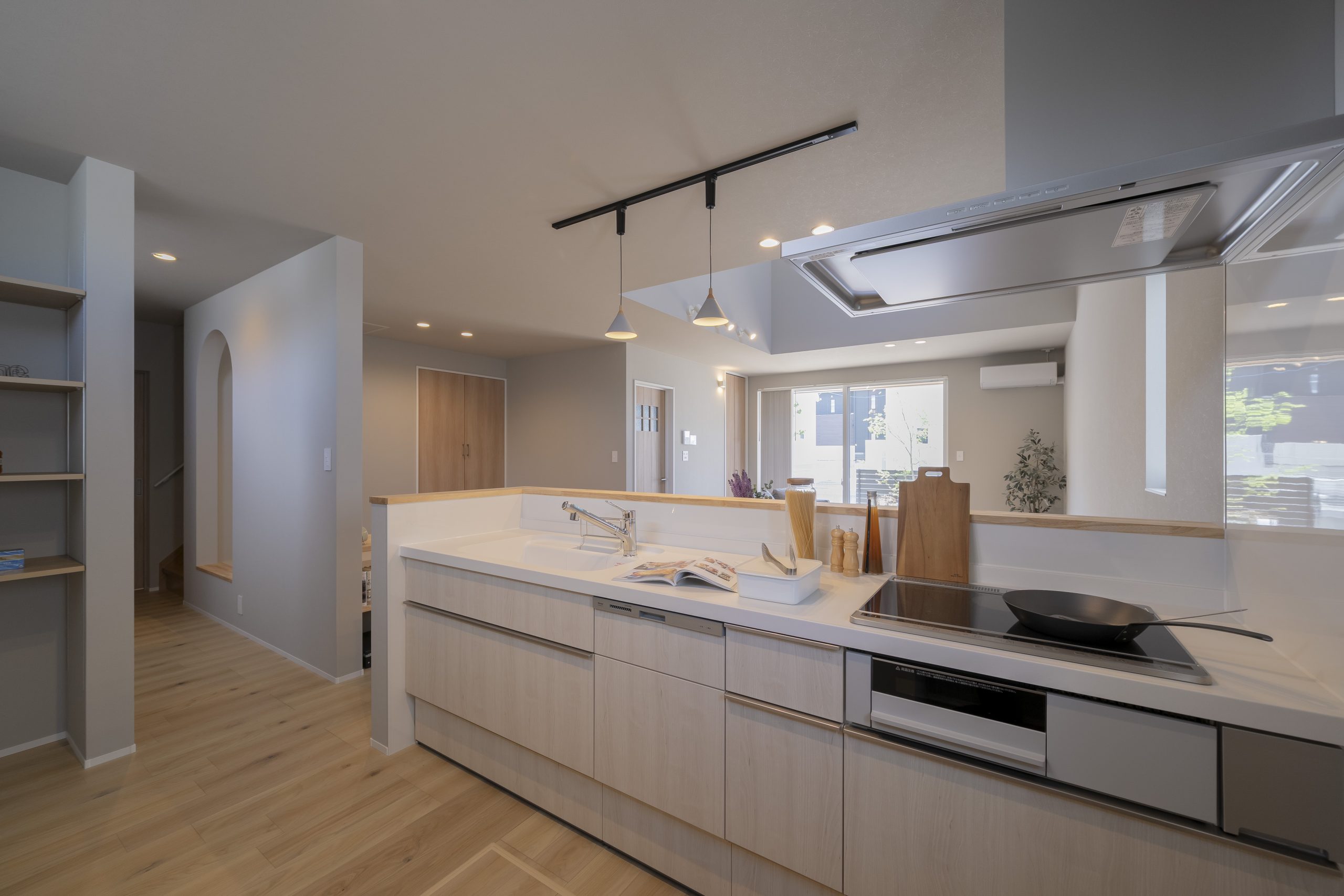 キッチンに立ちながらリビング全体を見渡せる開放的な設計。高窓から差し込む柔らかな光が、家族の団らんを温かく包み込む。