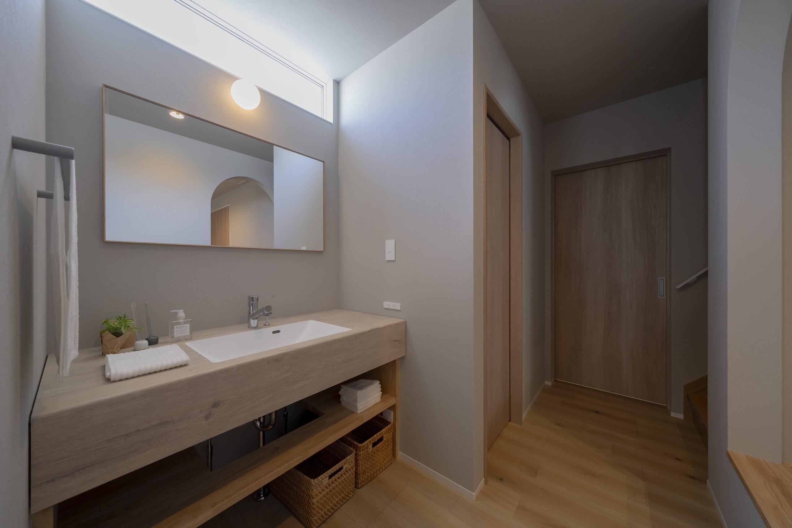 横幅の広い造作洗面台と大きな鏡が、ホテルライクな贅沢さを演出。見せる収納と使い勝手を両立し、日々の何気ない習慣に洗練さを添えてくれる。