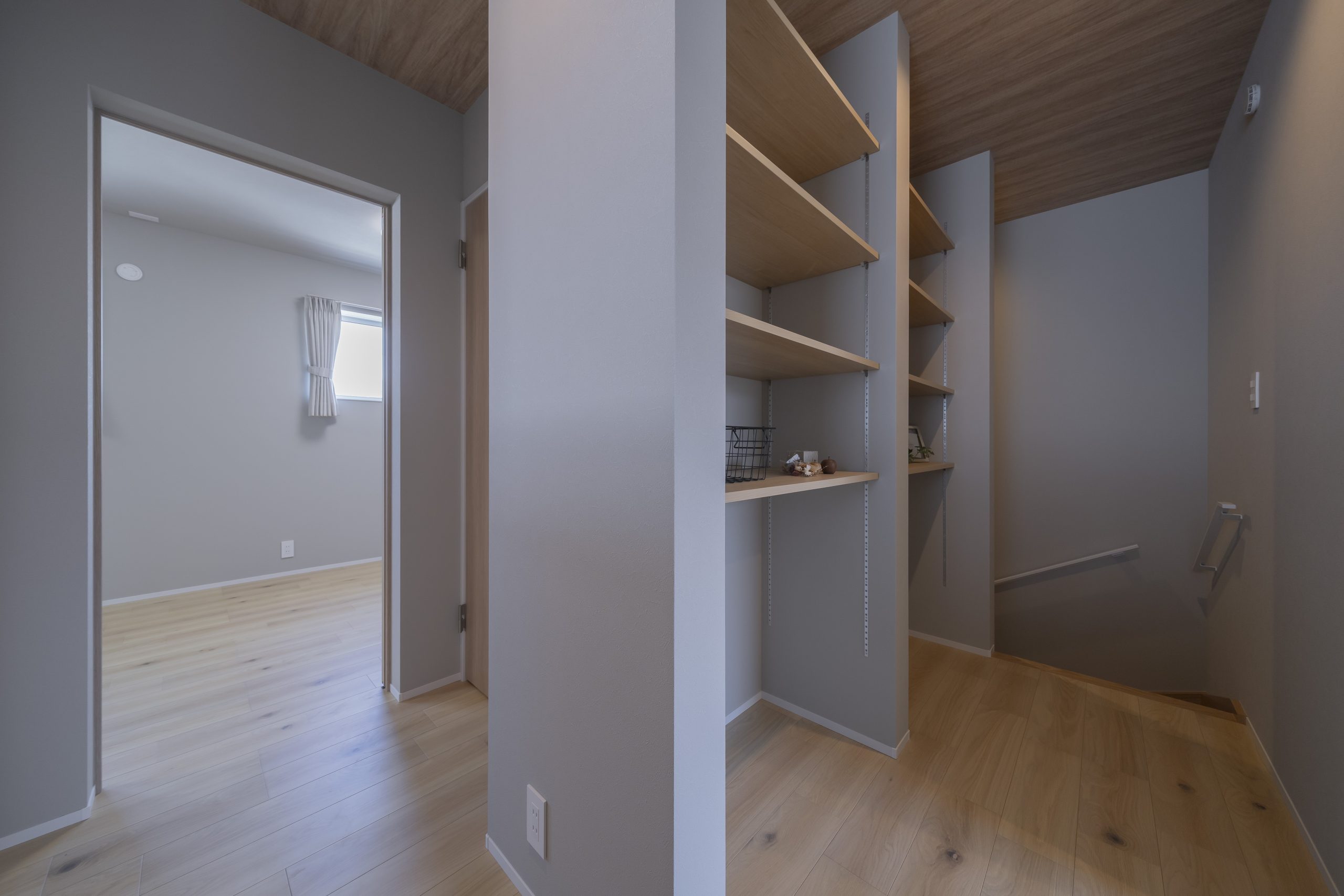 スペースを活かしたオープンな可動棚は、お気に入りの雑貨を飾るギャラリーとしても、暮らしを整える収納としても、家族の日常に寄り添ってくれる。