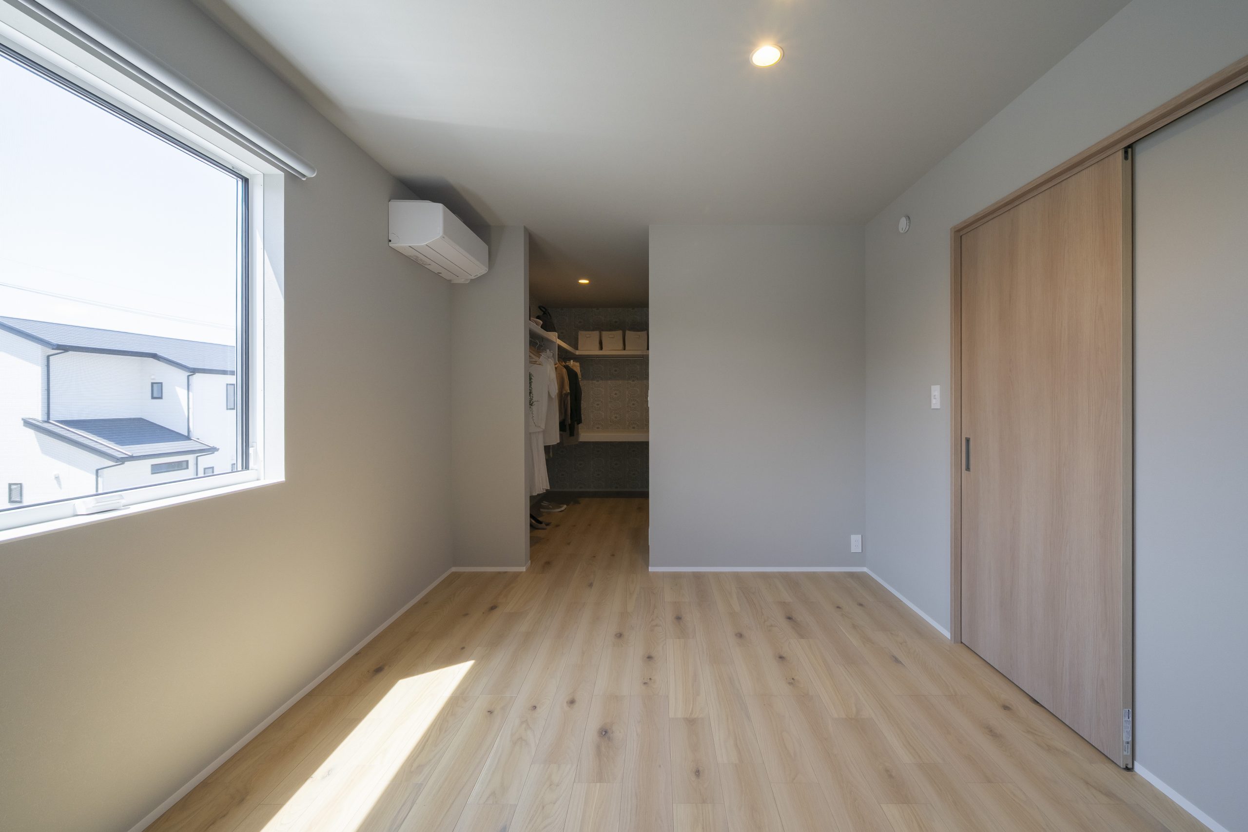 柔らかな光が差し込む寝室の奥に配された大容量のクローゼットは、朝の身支度をスムーズにし、整然とした心地よいプライベートタイムを約束してくれる。