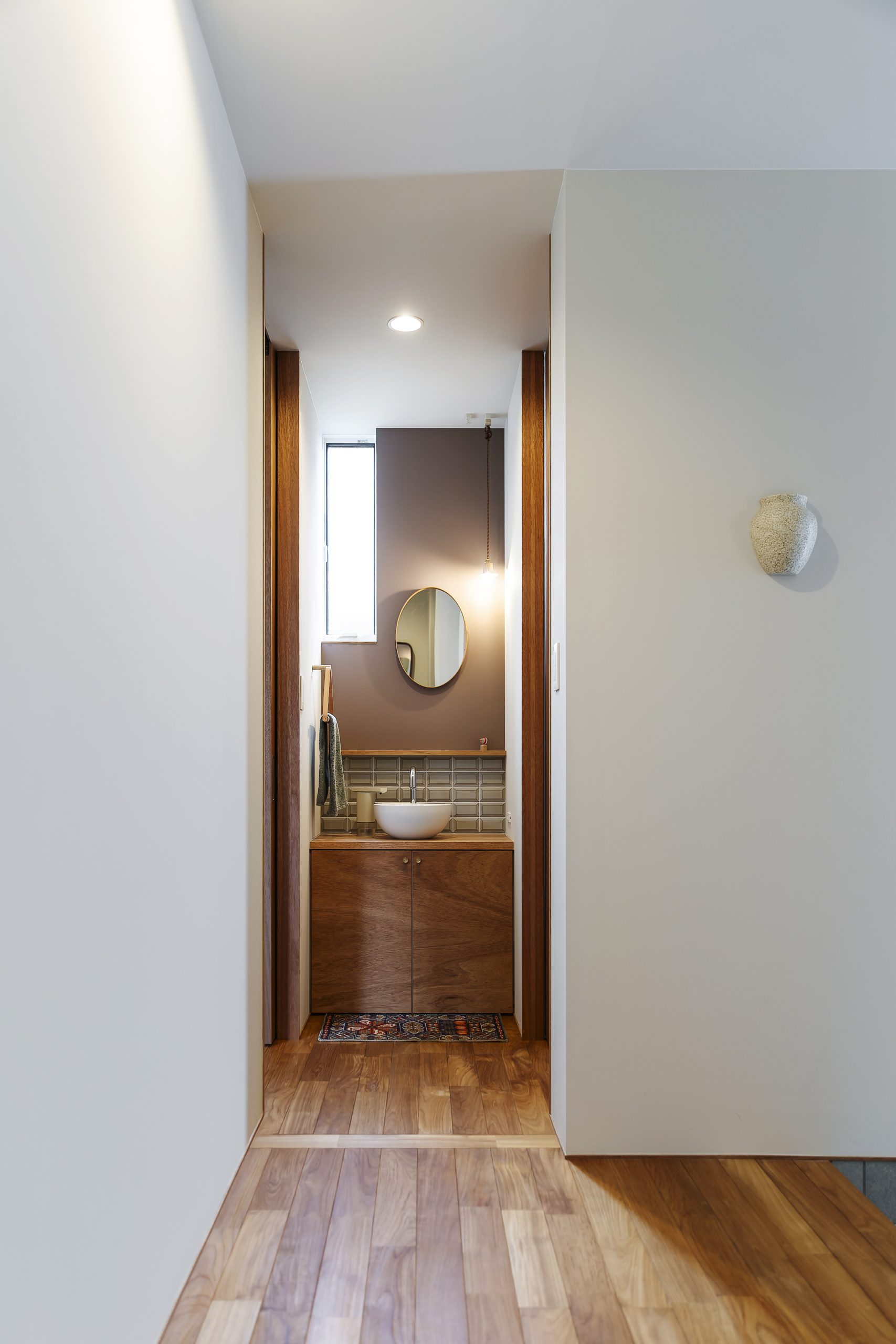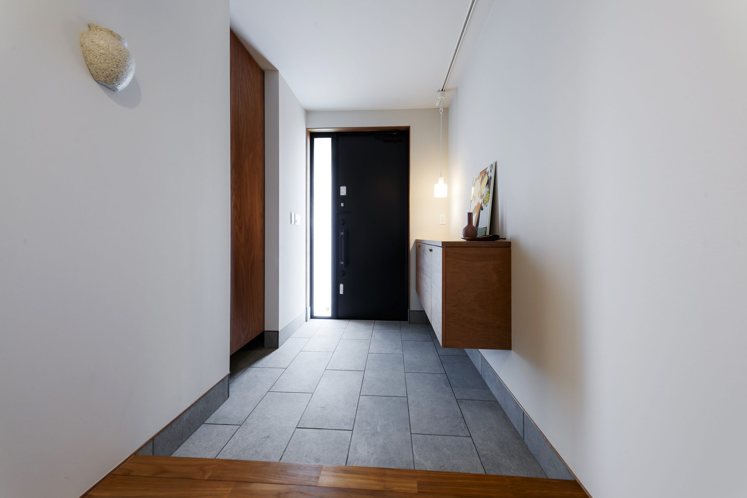 扉の隙間から差し込む一筋の光と、浮遊感のある浮き出しの収納。計算された陰影が、帰宅した瞬間に静寂と安らぎを与えてくれる。