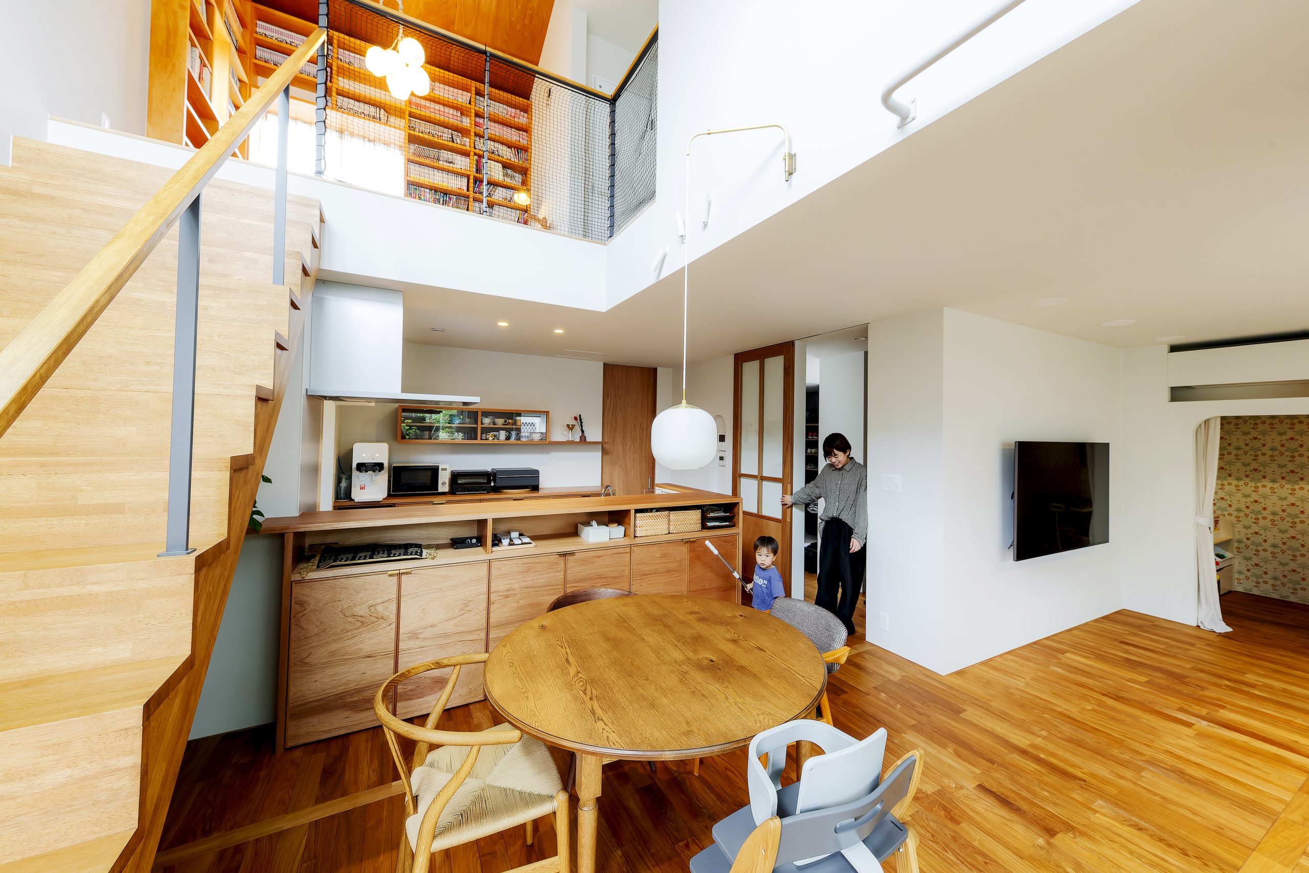 丸テーブルが主役となるダイニング。吹き抜けからの自然光で明るい空間に。