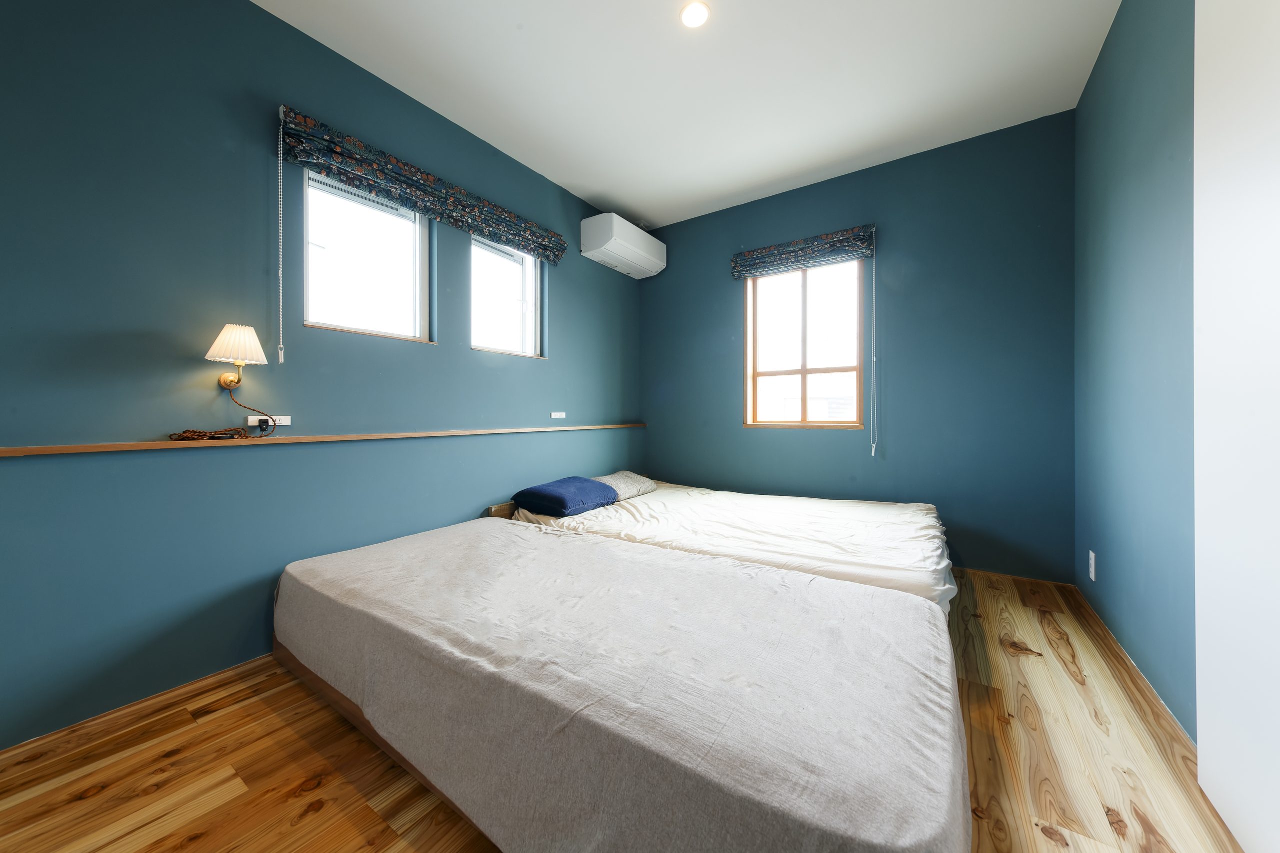 寝室の壁はヘイムスペイントという塗料でブルーグリーン色に塗装。