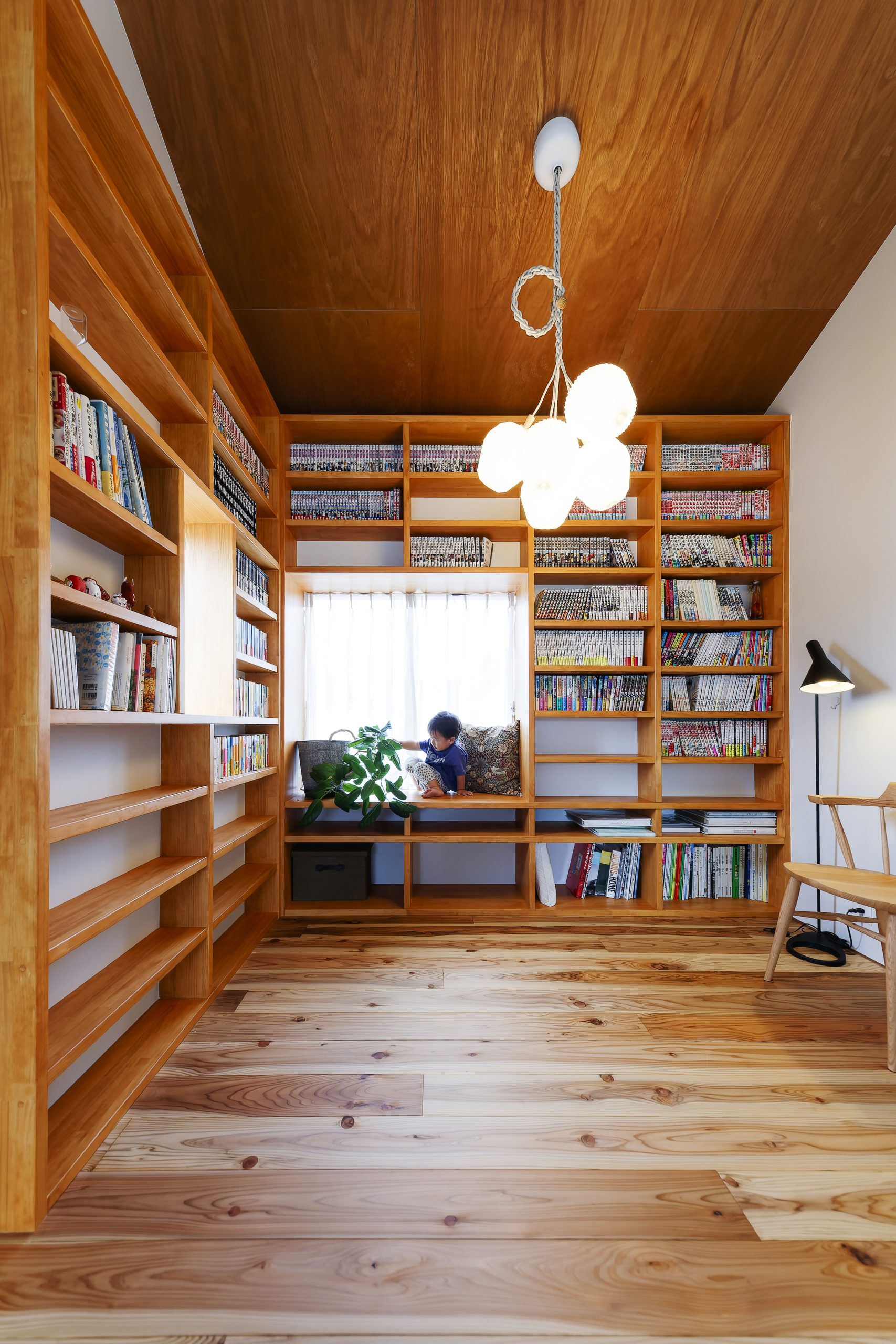 吹き抜け横に設けられた、ヌックのある本棚スペース。