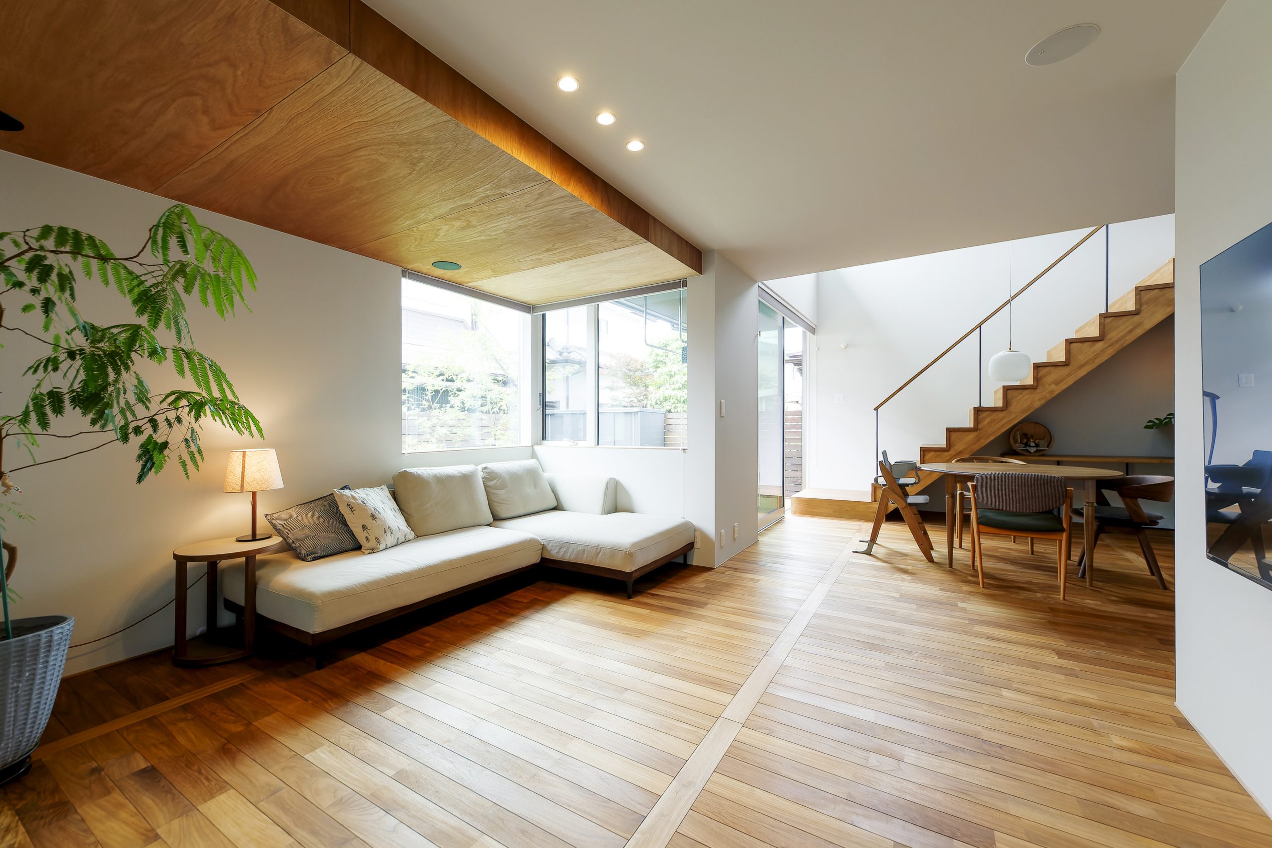 床材にはチークの無垢材、折り下げ天井部分にはラワンの合板を採用。