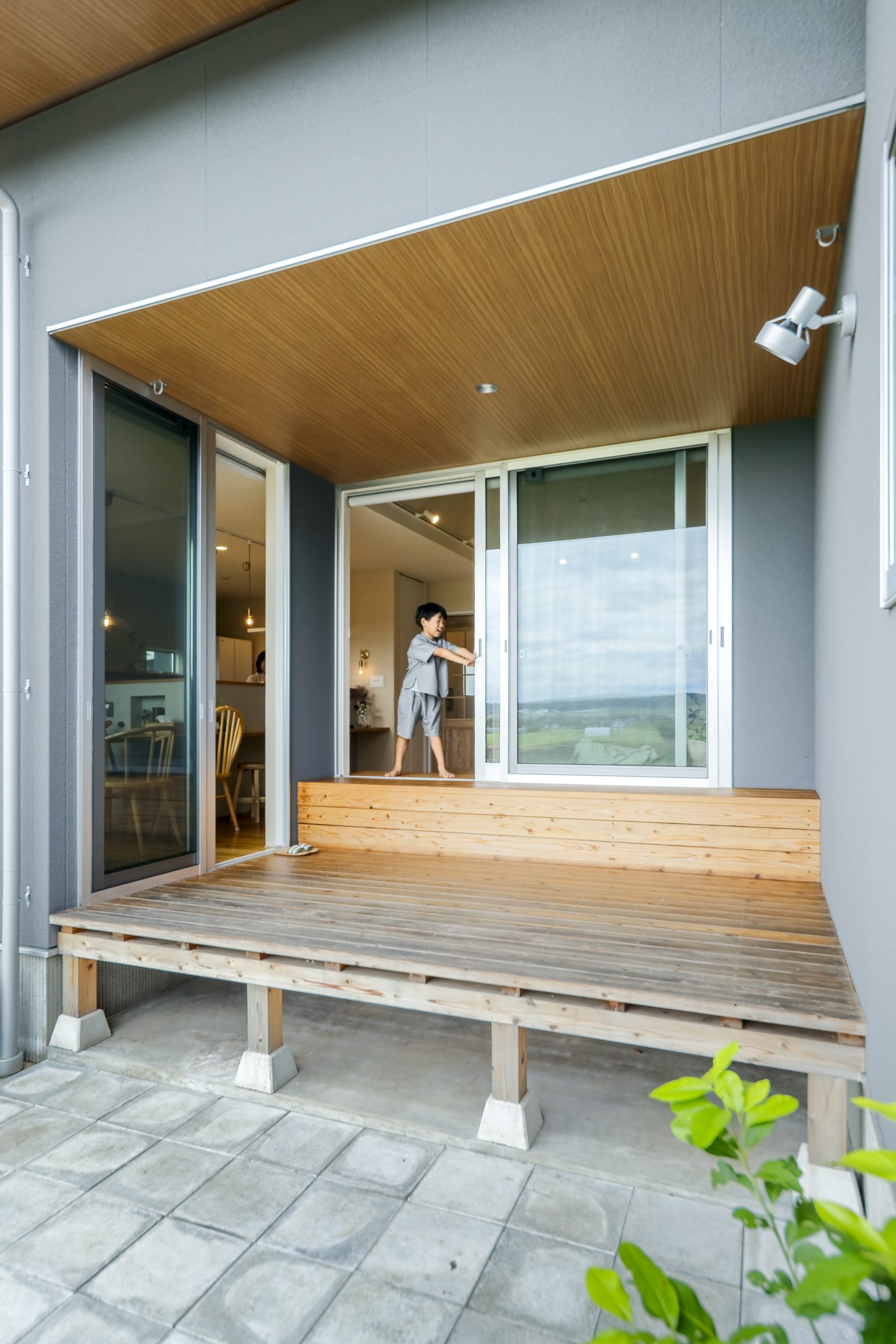 屋久島地杉のウッドデッキ。軒が深いのでセカンドリビングとしても大活躍。