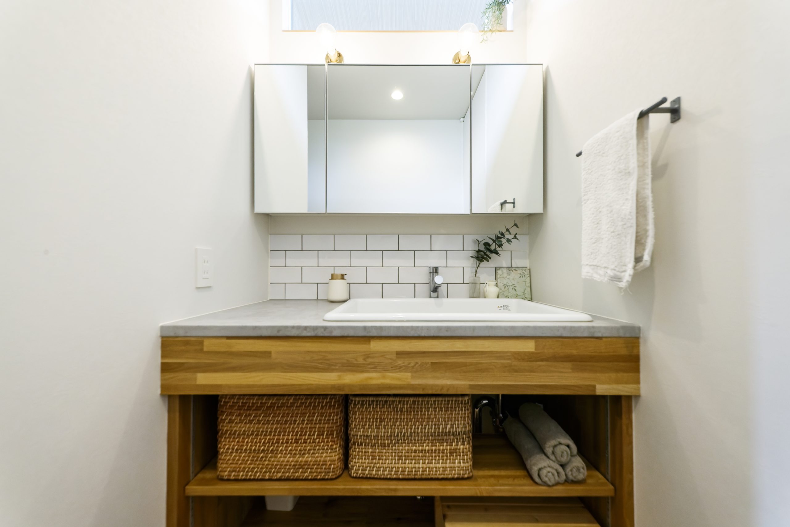 清潔感のある白のタイルが、シンプルながらもこだわりを感じさせる空間のアクセントに。