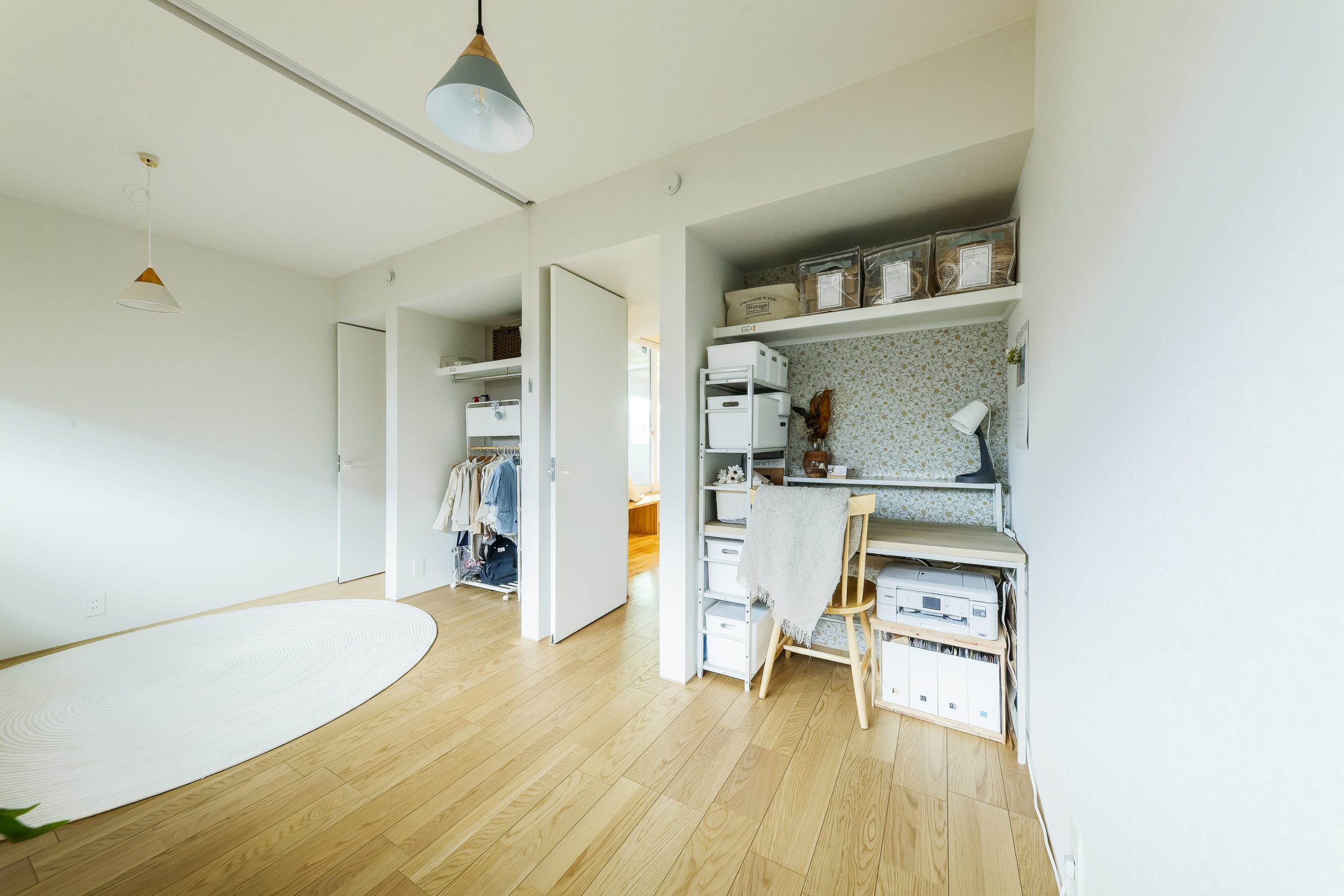 寝室には、塗り壁のような質感のフリース(不織布)壁紙を採用。