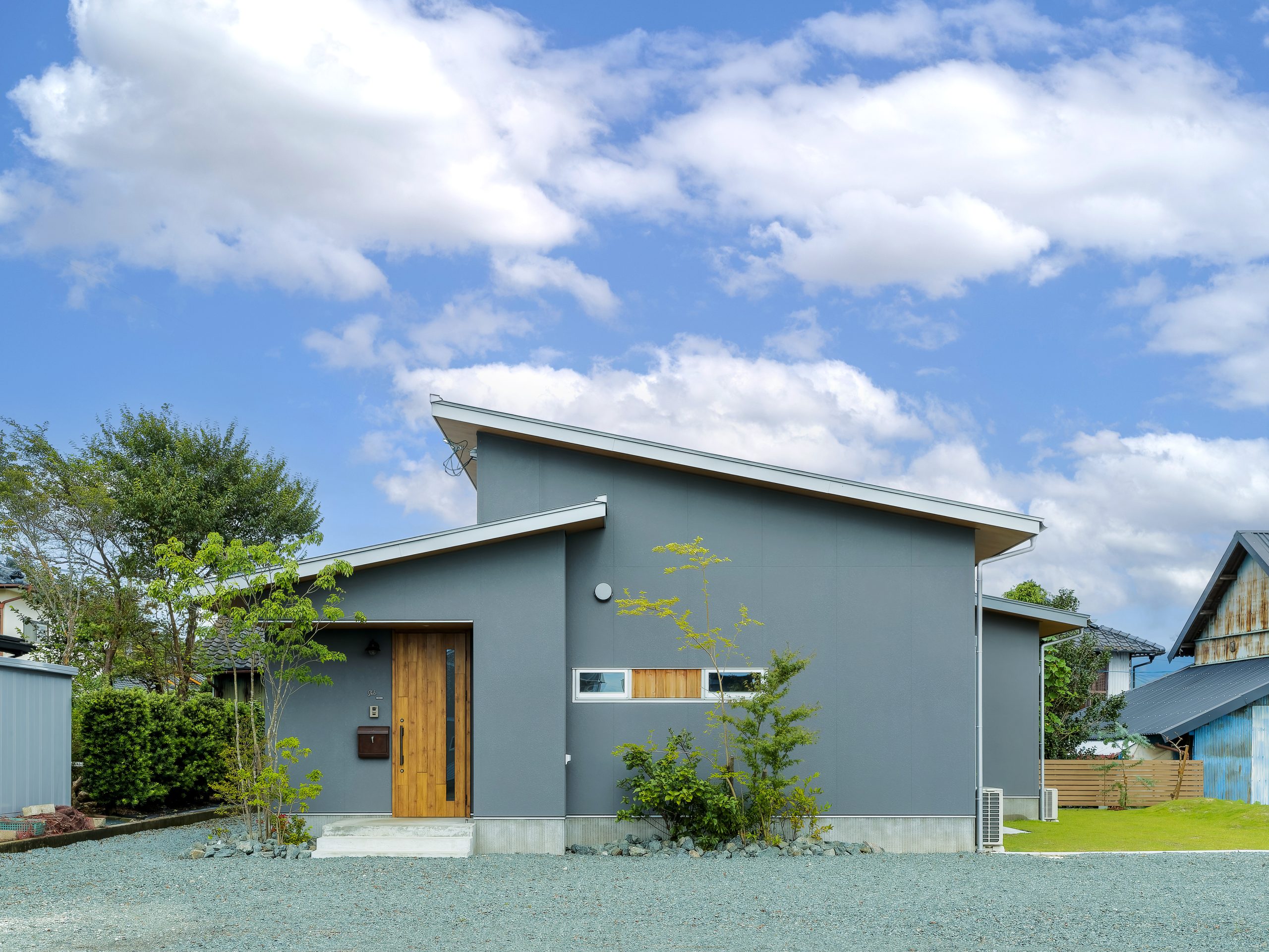 ゆったりとした時間が流れる住宅地に建つグレーの平屋。