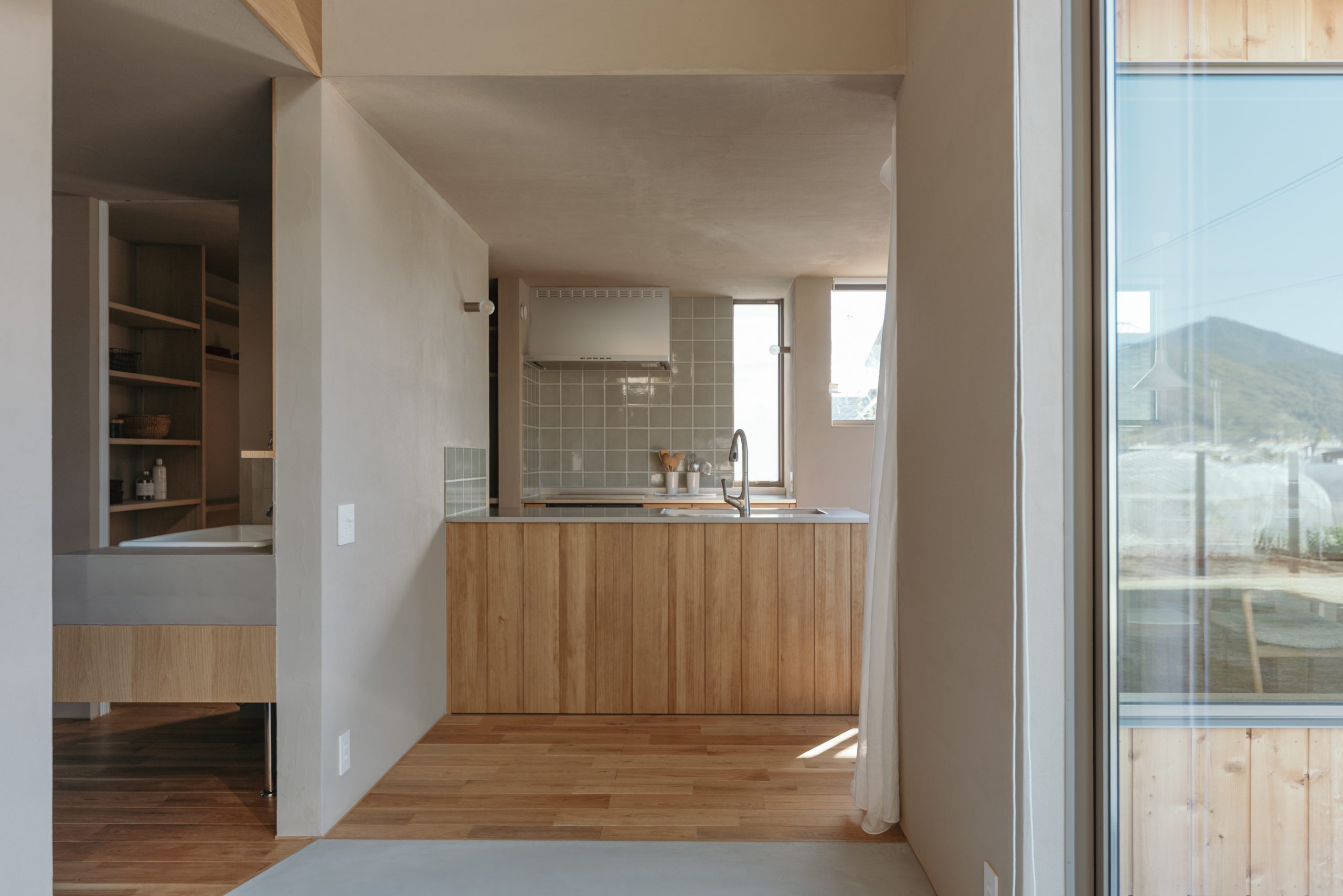 キッチンに立つと、大きな窓が切り取る山並みの借景。軒先の鎖樋や揺れる木の葉に、日常の中でふと心が整う景色があります。