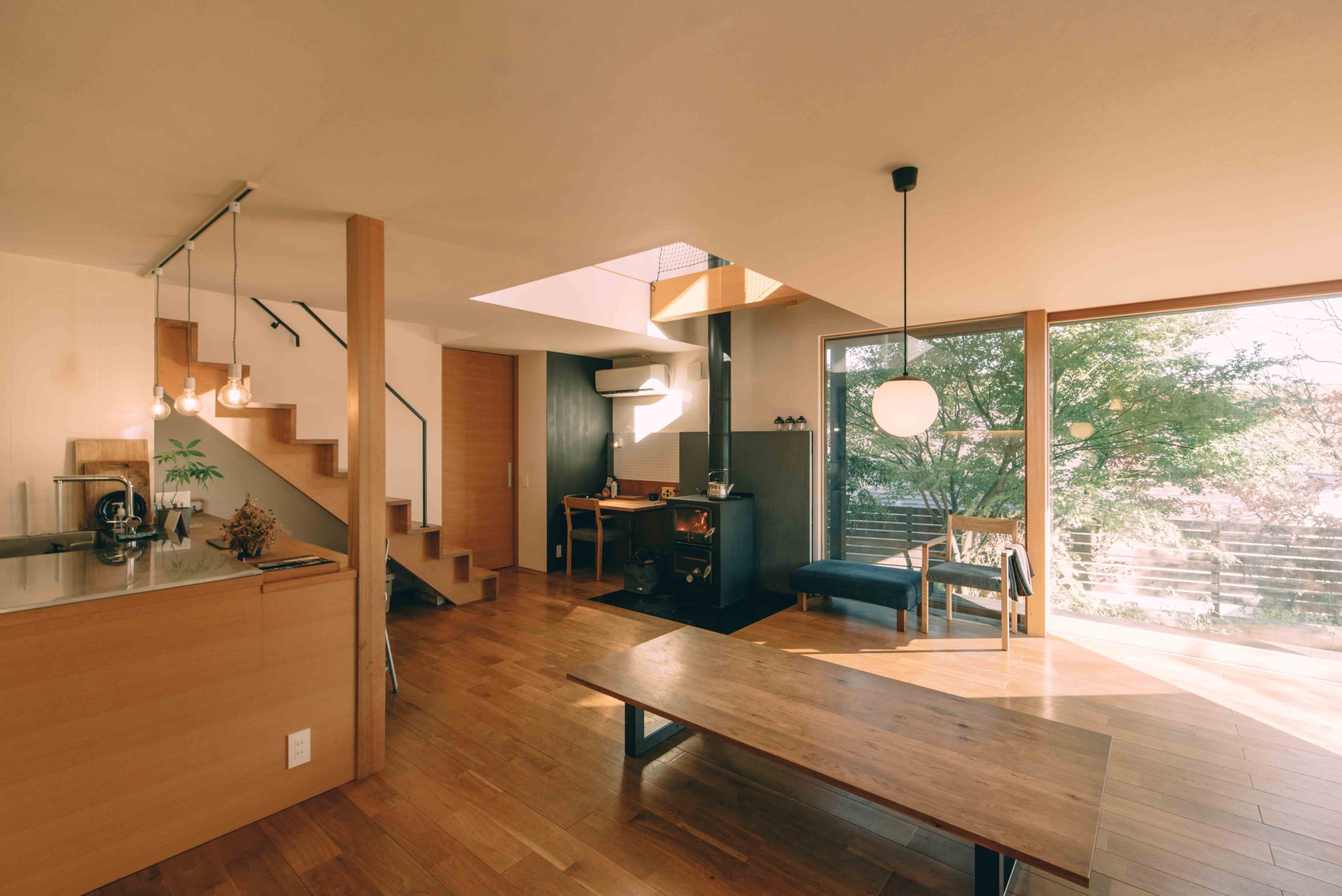 吹き抜けから降り注ぐ陽光が、無垢の床を優しく照らします。大きな開口部から取り込む緑が、室内外をゆるやかにつなぐ開放的な住まい。