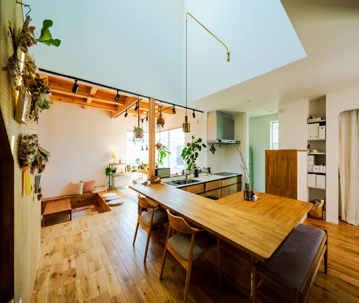 キッチンからつながる造作ダイニングをお家の中心。吹抜けによる開放感と明るさを感じる。